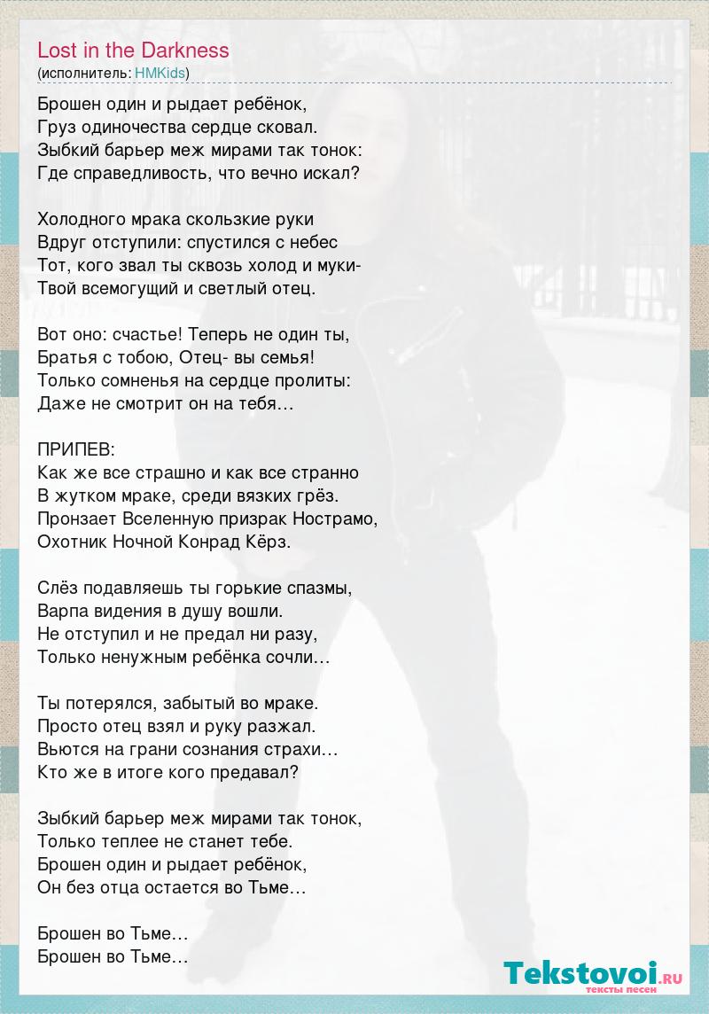 Брошен один и рыдает ребёнок, Груз одиночества сердце сковал. Зыбкий барьер меж мирами так тонок: Где справедливость, что вечно искал? Холодного мрака скользкие руки Вдруг отступили: спустился с небес Тот, кого звал ты сквозь холод и муки- Твой всемогущий и светлый отец. Вот оно: счастье! Теперь не один ты, Братья с тобою, Отец- вы семья! Только сомненья на сердце пролиты: Даже не смотрит он на тебя… ПРИПЕВ: Как же все страшно и как все странно В жутком мраке, среди вязких грёз. Пронзает Вселенную призрак Нострамо, Охотник Ночной Конрад Кёрз. Слёз подавляешь ты горькие спазмы, Варпа видения в душу вошли. Не отступил и не предал ни разу, Только ненужным ребёнка сочли… Ты потерялся, забытый во мраке. Просто отец взял и руку разжал. Вьются на грани сознания страхи… Кто же в итоге кого предавал? Зыбкий барьер меж мирами так тонок, Только теплее не станет тебе. Брошен один и рыдает ребёнок, Он без отца остается во Тьме… Брошен во Тьме… Брошен во Тьме…