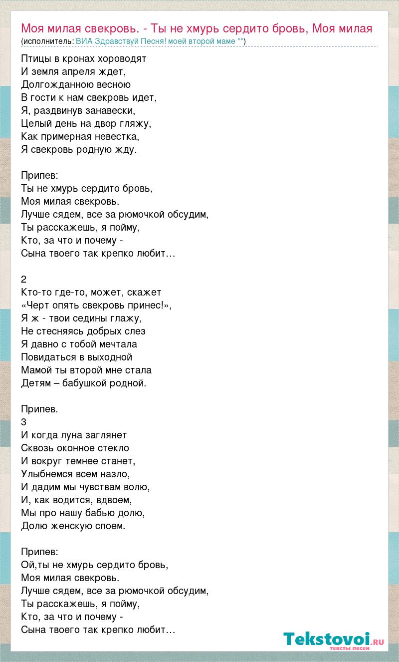 Птицы в кронах хороводят И земля апреля ждет, Долгожданною весною В гости к нам свекровь идет, Я, раздвинув занавески, Целый день на двор гляжу, Как примерная невестка, Я свекровь родную жду. Припев: Ты не хмурь сердито бровь, Моя милая свекровь. Лучше сядем, все за рюмочкой обсудим, Ты расскажешь, я пойму, Кто, за что и почему - Сына твоего так крепко любит… 2 Кто-то где-то, может, скажет «Черт опять свекровь принес!», Я ж - твои седины глажу, Не стесняясь добрых слез Я давно с тобой мечтала Повидаться в выходной Мамой ты второй мне стала Детям – бабушкой родной. Припев. 3 И когда луна заглянет Сквозь оконное стекло И вокруг темнее станет, Улыбнемся всем назло, И дадим мы чувствам волю, И, как водится, вдвоем, Мы про нашу бабью долю, Долю женскую споем. Припев: Ой,ты не хмурь сердито бровь, Моя милая свекровь. Лучше сядем, все за рюмочкой обсудим, Ты расскажешь, я пойму, Кто, за что и почему - Сына твоего так крепко любит…
