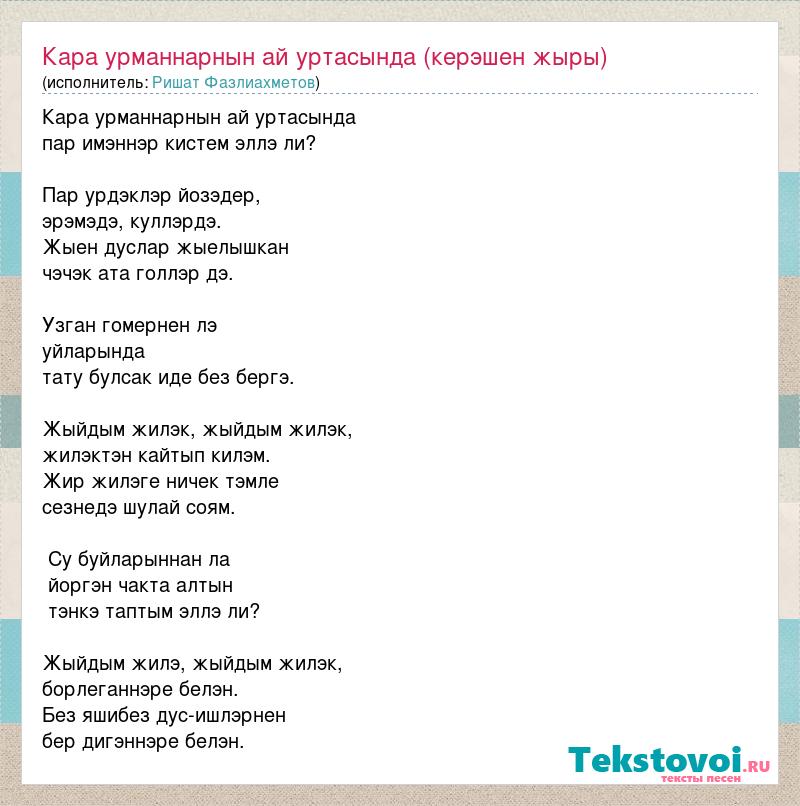 Кара урманнарнын ай уртасында пар имэннэр кистем эллэ ли? Пар урдэклэр йозэдер, эрэмэдэ, куллэрдэ. Жыен дуслар жыелышкан чэчэк ата голлэр дэ. Узган гомернен лэ уйларында тату булсак иде без бергэ. Жыйдым жилэк, жыйдым жилэк, жилэктэн кайтып килэм. Жир жилэге ничек тэмле сезнедэ шулай соям. Су буйларыннан ла йоргэн чакта алтын тэнкэ таптым эллэ ли? Жыйдым жилэ, жыйдым жилэк, борлеганнэре белэн. Без яшибез дус-ишлэрнен бер дигэннэре белэн.