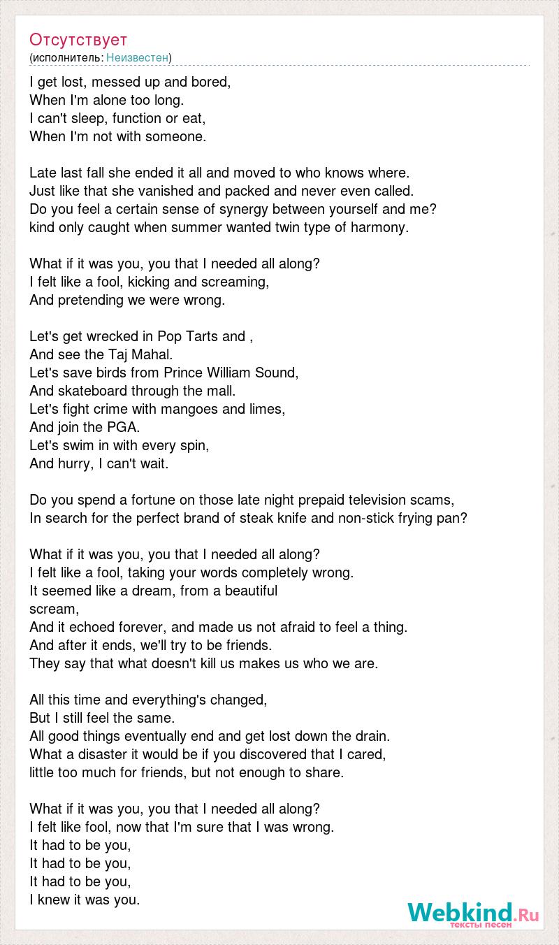 I get lost, messed up and bored, When I'm alone too long. I can't sleep, function or eat, When I'm not with someone. Late last fall she ended it all and moved to who knows where. Just like that she vanished and packed and never even called. Do you feel a certain sense of synergy between yourself and me? kind only caught when summer wanted twin type of harmony. What if it was you, you that I needed all along? I felt like a fool, kicking and screaming, And pretending we were wrong. Let's get wrecked in Pop Tarts and , And see the Taj Mahal. Let's save birds from Prince William Sound, And skateboard through the mall. Let's fight crime with mangoes and limes, And join the PGA. Let's swim in with every spin, And hurry, I can't wait. Do you spend a fortune on those late night prepaid television scams, In search for the perfect brand of steak knife and non-stick frying pan? What if it was you, you that I needed all along? I felt like a fool, taking your words completely wrong. It seemed like a dream, from a beautiful scream, And it echoed forever, and made us not afraid to feel a thing. And after it ends, we'll try to be friends. They say that what doesn't kill us makes us who we are. All this time and everything's changed, But I still feel the same. All good things eventually end and get lost down the drain. What a disaster it would be if you discovered that I cared, little too much for friends, but not enough to share. What if it was you, you that I needed all along? I felt like fool, now that I'm sure that I was wrong. It had to be you, It had to be you, It had to be you, I knew it was you.