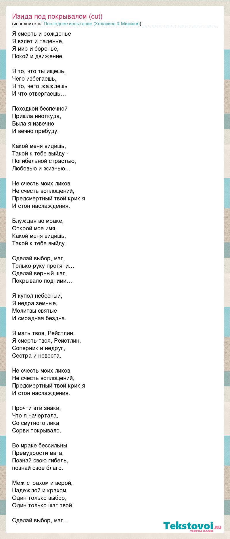 Я смерть и рожденье Я взлет и паденье, Я мир и боренье, Покой и движение. Я то, что ты ищешь, Чего избегаешь, Я то, чего жаждешь И что отвергаешь… Походкой беспечной Пришла ниоткуда, Была я извечно И вечно пребуду. Какой меня видишь, Такой к тебе выйду - Погибельной страстью, Любовью и жизнью… Не счесть моих ликов, Не счесть воплощений, Предсмертный твой крик я И стон наслаждения. Блуждая во мраке, Открой мое имя, Какой меня видишь, Такой к тебе выйду. Сделай выбор, маг, Только руку протяни… Сделай верный шаг, Покрывало подними… Я купол небесный, Я недра земные, Молитвы святые И смрадная бездна. Я мать твоя, Рейстлин, Я смерть твоя, Рейстлин, Соперник и недруг, Сестра и невеста. Не счесть моих ликов, Не счесть воплощений, Предсмертный твой крик я И стон наслаждения. Прочти эти знаки, Что я начертала, Со смутного лика Сорви покрывало. Во мраке бессильны Премудрости мага, Познай свою гибель, познай свое благо. Меж страхом и верой, Надеждой и крахом Один только выбор, Один только шаг твой. Сделай выбор, маг…
