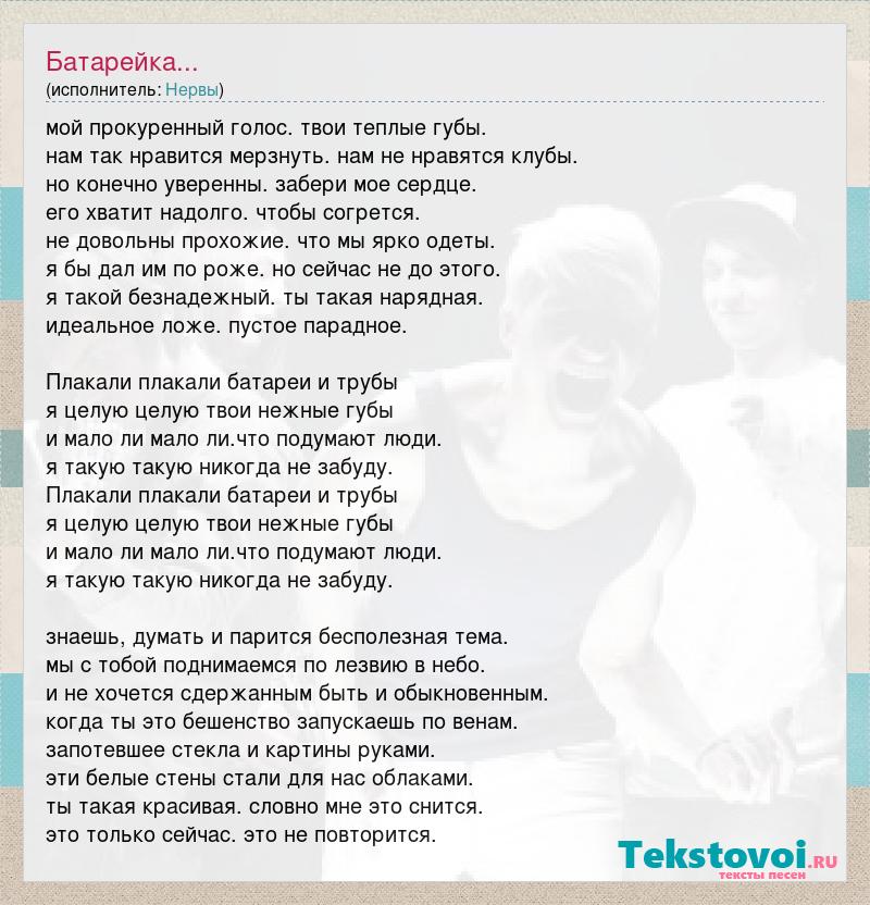 мой прокуренный голос. твои теплые губы. нам так нравится мерзнуть. нам не нравятся клубы. но конечно уверенны. забери мое сердце. его хватит надолго. чтобы согрется. не довольны прохожие. что мы ярко одеты. я бы дал им по роже. но сейчас не до этого. я такой безнадежный. ты такая нарядная. идеальное ложе. пустое парадное. Плакали плакали батареи и трубы я целую целую твои нежные губы и мало ли мало ли.что подумают люди. я такую такую никогда не забуду. Плакали плакали батареи и трубы я целую целую твои нежные губы и мало ли мало ли.что подумают люди. я такую такую никогда не забуду. знаешь, думать и парится бесполезная тема. мы с тобой поднимаемся по лезвию в небо. и не хочется сдержанным быть и обыкновенным. когда ты это бешенство запускаешь по венам. запотевшее стекла и картины руками. эти белые стены стали для нас облаками. ты такая красивая. словно мне это снится. это только сейчас. это не повторится.