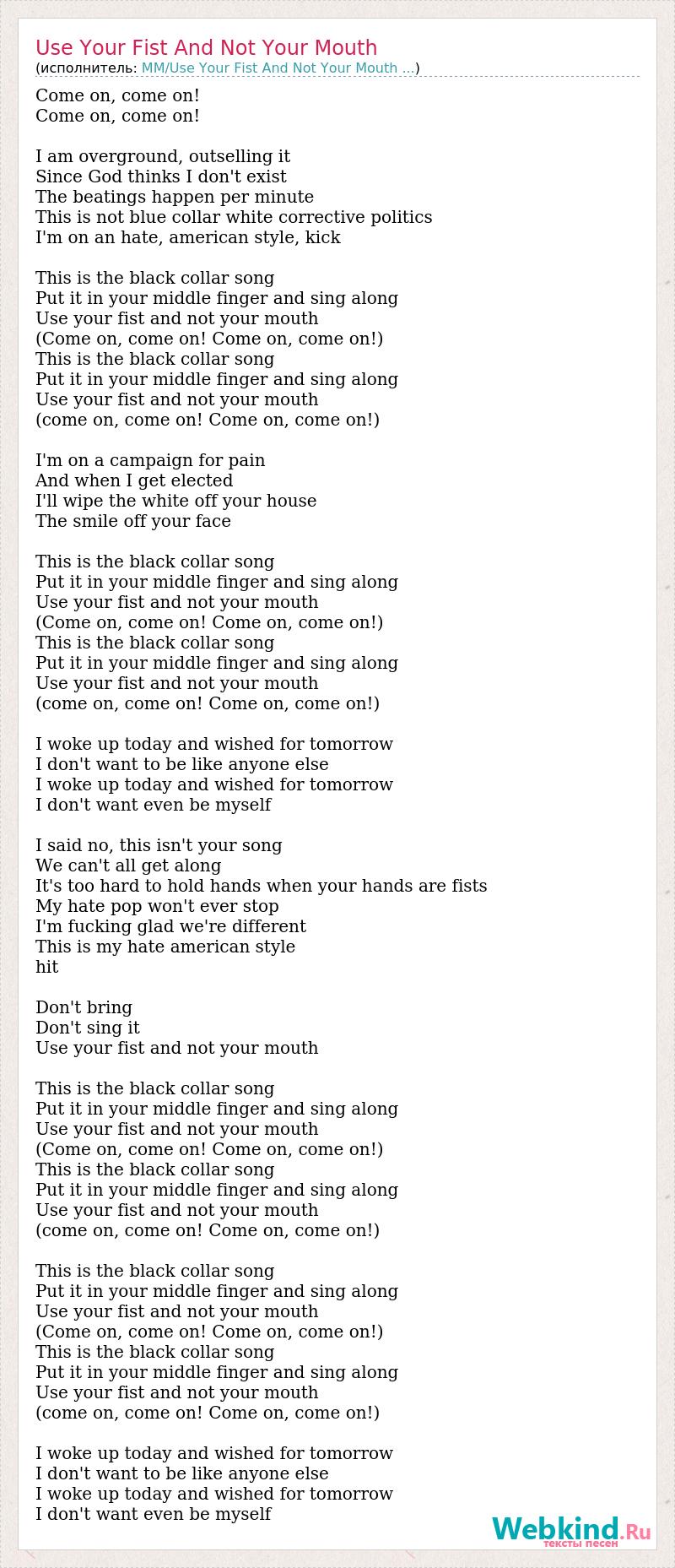 Come on, come on! Come on, come on! I am overground, outselling it Since God thinks I don't exist The beatings happen per minute This is not blue collar white corrective politics I'm on an hate, american style, kick This is the black collar song Put it in your middle finger and sing along Use your fist and not your mouth (Come on, come on! Come on, come on!) This is the black collar song Put it in your middle finger and sing along Use your fist and not your mouth (come on, come on! Come on, come on!) I'm on a campaign for pain And when I get elected I'll wipe the white off your house The smile off your face This is the black collar song Put it in your middle finger and sing along Use your fist and not your mouth (Come on, come on! Come on, come on!) This is the black collar song Put it in your middle finger and sing along Use your fist and not your mouth (come on, come on! Come on, come on!) I woke up today and wished for tomorrow I don't want to be like anyone else I woke up today and wished for tomorrow I don't want even be myself I said no, this isn't your song We can't all get along It's too hard to hold hands when your hands are fists My hate pop won't ever stop I'm fucking glad we're different This is my hate american style hit Don't bring Don't sing it Use your fist and not your mouth This is the black collar song Put it in your middle finger and sing along Use your fist and not your mouth (Come on, come on! Come on, come on!) This is the black collar song Put it in your middle finger and sing along Use your fist and not your mouth (come on, come on! Come on, come on!) This is the black collar song Put it in your middle finger and sing along Use your fist and not your mouth (Come on, come on! Come on, come on!) This is the black collar song Put it in your middle finger and sing along Use your fist and not your mouth (come on, come on! Come on, come on!) I woke up today and wished for tomorrow I don't want to be like anyone else I woke up today and wished for tomorrow I don't want even be myself