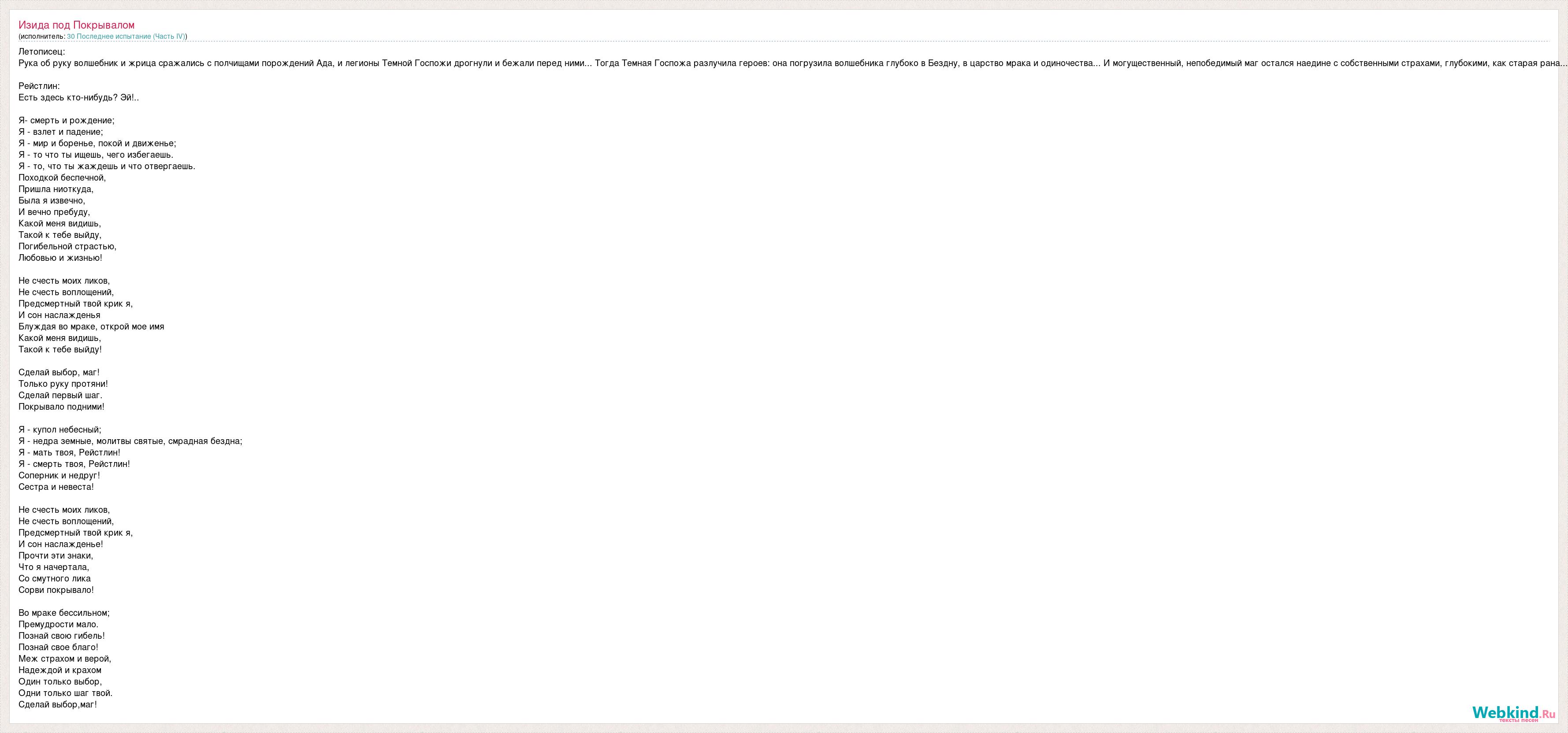 Летописец: Рука об руку волшебник и жрица сражались с полчищами порождений Ада, и легионы Темной Госпожи дрогнули и бежали перед ними... Тогда Темная Госпожа разлучила героев: она погрузила волшебника глубоко в Бездну, в царство мрака и одиночества... И могущественный, непобедимый маг остался наедине с собственными страхами, глубокими, как старая рана... Рейстлин: Есть здесь кто-нибудь? Эй!.. Я- смерть и рождение; Я - взлет и падение; Я - мир и боренье, покой и движенье; Я - то что ты ищешь, чего избегаешь. Я - то, что ты жаждешь и что отвергаешь. Походкой беспечной, Пришла ниоткуда, Была я извечно, И вечно пребуду, Какой меня видишь, Такой к тебе выйду, Погибельной страстью, Любовью и жизнью! Не счесть моих ликов, Не счесть воплощений, Предсмертный твой крик я, И сон наслажденья Блуждая во мраке, открой мое имя Какой меня видишь, Такой к тебе выйду! Сделай выбор, маг! Только руку протяни! Сделай первый шаг. Покрывало подними! Я - купол небесный; Я - недра земные, молитвы святые, смрадная бездна; Я - мать твоя, Рейстлин! Я - смерть твоя, Рейстлин! Соперник и недруг! Сестра и невеста! Не счесть моих ликов, Не счесть воплощений, Предсмертный твой крик я, И сон наслажденье! Прочти эти знаки, Что я начертала, Со смутного лика Сорви покрывало! Во мраке бессильном; Премудрости мало. Познай свою гибель! Познай свое благо! Меж страхом и верой, Надеждой и крахом Один только выбор, Одни только шаг твой. Сделай выбор,маг!