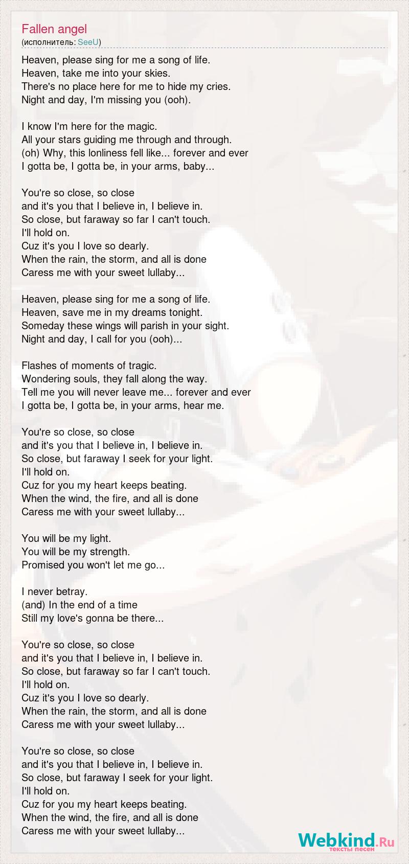 Heaven, please sing for me a song of life. Heaven, take me into your skies. There's no place here for me to hide my cries. Night and day, I'm missing you (ooh). I know I'm here for the magic. All your stars guiding me through and through. (oh) Why, this lonliness fell like... forever and ever I gotta be, I gotta be, in your arms, baby... You're so close, so close and it's you that I believe in, I believe in. So close, but faraway so far I can't touch. I'll hold on. Cuz it's you I love so dearly. When the rain, the storm, and all is done Caress me with your sweet lullaby... Heaven, please sing for me a song of life. Heaven, save me in my dreams tonight. Someday these wings will parish in your sight. Night and day, I call for you (ooh)... Flashes of moments of tragic. Wondering souls, they fall along the way. Tell me you will never leave me... forever and ever I gotta be, I gotta be, in your arms, hear me. You're so close, so close and it's you that I believe in, I believe in. So close, but faraway I seek for your light. I'll hold on. Cuz for you my heart keeps beating. When the wind, the fire, and all is done Caress me with your sweet lullaby... You will be my light. You will be my strength. Promised you won't let me go... I never betray. (and) In the end of a time Still my love's gonna be there... You're so close, so close and it's you that I believe in, I believe in. So close, but faraway so far I can't touch. I'll hold on. Cuz it's you I love so dearly. When the rain, the storm, and all is done Caress me with your sweet lullaby... You're so close, so close and it's you that I believe in, I believe in. So close, but faraway I seek for your light. I'll hold on. Cuz for you my heart keeps beating. When the wind, the fire, and all is done Caress me with your sweet lullaby...
