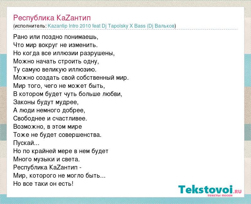 Рано или поздно понимаешь, Что мир вокруг не изменить. Но когда все иллюзии разрушены, Можно начать строить одну, Ту самую великую иллюзию. Можно создать свой собственный мир. Мир того, чего не может быть, В котором будет чуть больше любви, Законы будут мудрее, А люди немного добрее, Свободнее и счастливее. Возможно, в этом мире Тоже не будет совершенства. Пускай... Но по крайней мере в нем будет Много музыки и света. Республика КаZантип - Мир, которого не могло быть... Но все таки он есть!