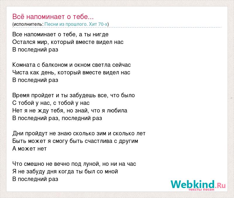 Все напоминает о тебе, а ты нигде Остался мир, который вместе видел нас В последний раз Комната с балконом и окном светла сейчас Чиста как день, который вместе видел нас В последний раз Время пройдет и ты забудешь все, что было С тобой у нас, с тобой у нас Нет я не жду тебя, но знай, что я любила В последний раз, последний раз Дни пройдут не знаю сколько зим и сколько лет Быть может я смогу быть счастлива с другим А может нет Что смешно не вечно под луной, но ни на час Я не забуду дня когда ты был со мной В последний раз