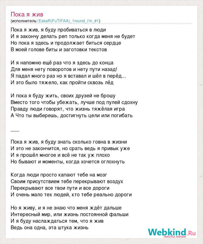 Пока я жив, я буду пробиваться в люди И я закончу делать реп только когда меня не будет Но пока я здесь и продолжает биться сердце В моей голове биты и заготовки текстов И я напомню ещё раз что я здесь до конца Для меня нету поворотов и нету пути назад! Я падал много раз но я вставал и шёл в перёд... И это было тяжело, как пройти сквозь лёд И пока я буду жить, своих друзей не брошу Вместо того чтобы убежать, лучше под пулей сдохну Правду люди говорят, что жизнь тяжёлая игра А Что ты выберешь, достигнуть цели или погибать ___ Пока я жив, я буду знать сколько говна в жизни И это не закончится, но срать ведь я привык уже И я прошёл многое и всё не так уж плохо Но бывают и моменты, когда хочется оглохнуть Когда люди просто капают тебе на мозг Своим присутствием тебе перекрывают воздух Перекрывают все твои пути и все дороги И очень мало тех людей, кто тебе реально дороги Но я живу, и я не знаю что меня ждёт дальше Интересный мир, или жизнь постоянной фальши И я буду наслаждаться тем, что я жив Ведь она одна, эта штука жизнь