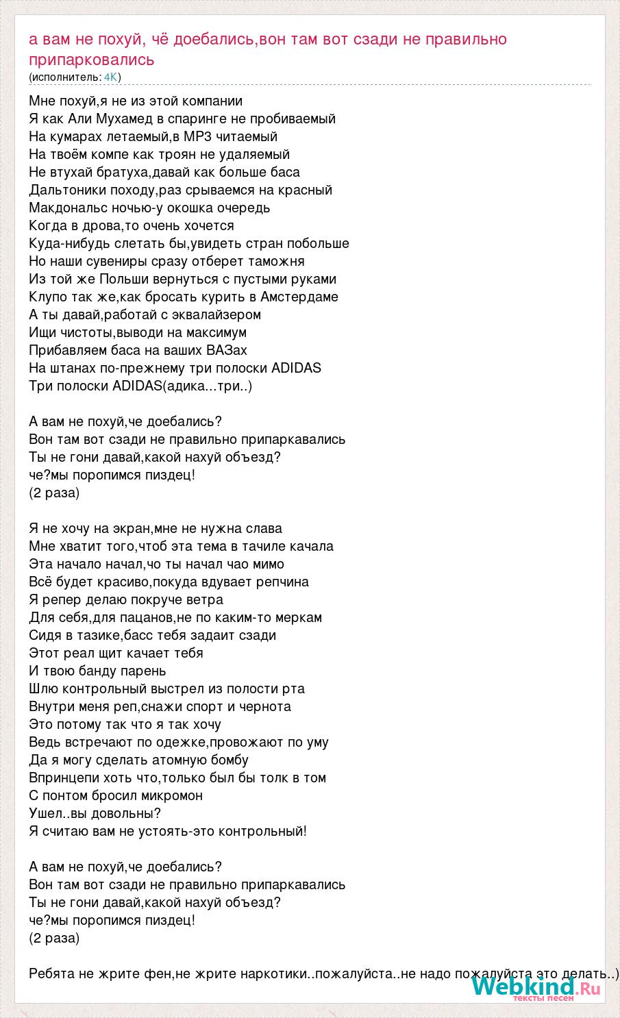 Мне похуй,я не из этой компании Я как Али Мухамед в спаринге не пробиваемый На кумарах летаемый,в MP3 читаемый На твоём компе как троян не удаляемый Не втухай братуха,давай как больше баса Дальтоники походу,раз срываемся на красный Макдональс ночью-у окошка очередь Когда в дрова,то очень хочется Куда-нибудь слетать бы,увидеть стран побольше Но наши сувениры сразу отберет таможня Из той же Польши вернуться с пустыми руками Клупо так же,как бросать курить в Амстердаме А ты давай,работай с эквалайзером Ищи чистоты,выводи на максимум Прибавляем баса на ваших ВАЗах На штанах по-прежнему три полоски ADIDAS Три полоски ADIDAS(адика...три..) А вам не похуй,че доебались? Вон там вот сзади не правильно припаркавались Ты не гони давай,какой нахуй объезд? че?мы поропимся пиздец! (2 раза) Я не хочу на экран,мне не нужна слава Мне хватит того,чтоб эта тема в тачиле качала Эта начало начал,чо ты начал чао мимо Всё будет красиво,покуда вдувает репчина Я репер делаю покруче ветра Для себя,для пацанов,не по каким-то меркам Сидя в тазике,басс тебя задаит сзади Этот реал щит качает тебя И твою банду парень Шлю контрольный выстрел из полости рта Внутри меня реп,снажи спорт и чернота Это потому так что я так хочу Ведь встречают по одежке,провожают по уму Да я могу сделать атомную бомбу Впринцепи хоть что,только был бы толк в том С понтом бросил микромон Ушел..вы довольны? Я считаю вам не устоять-это контрольный! А вам не похуй,че доебались? Вон там вот сзади не правильно припаркавались Ты не гони давай,какой нахуй объезд? че?мы поропимся пиздец! (2 раза) Ребята не жрите фен,не жрите наркотики..пожалуйста..не надо пожалуйста это делать..)