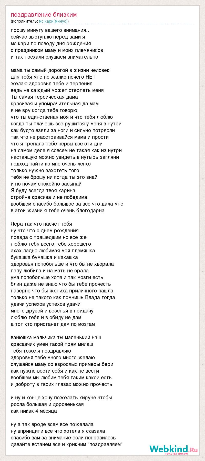 прошу минуту вашего внимания.. сейчас выступлю перед вами я мс.кари по поводу дня рождения с праздником маму и моих племяников и так поехали слушаем внимательно мама ты самый дорогой в жизни человек для тебя мне не жалко нечего НЕТ желаю здоровья тебе и терпения ведь не каждый может стерпеть меня Ты самая героическая дама красивая и упомрачительная да мам я не вру когда тебе говорю что ты единственая моя и что тебя люблю когда ты плачешь все рушится у меня в нутри как будто взяли за ноги и сильно потрясли так что не расстраивайся мама и прости что я трепала тебе нервы все эти дни на самом деле я совсем не такая как из нутри настаящую можно увидеть в нутырь загляни подход найти ко мне очень легко только нужно захотеть того тебя не брошу ни когда ты это знай и по ночам спокойно засыпай Я буду всегда твоя карина стройна красива и не победима вообщем спасибо большое за все что дала мне в этой жизни я тебе очень блогодарна Лера так что насчет тебя ну что что с днем рождения правда с прашедшим но все же люблю тебя всего тебе хорошего ахах ладно любимая моя племяшка букашка бумашка и какашка здоровья попобольше и что бы не хворала папу любила и на мать не орала ума попобольше хотя и так мозги есть блин даже не знаю что бы тебе прочесть наверно что бы жениха приличного нашла только не такого как помнишь Влада тогда удачи успехов успехов удачи много друзей и везенья в придачу люблю тебя и в обиду не дам а тот кто пристанет дам по мозгам ванюшка мальчика ты маленький наш красавчик умен такой прям милаш тебя тоже я поздравляю здоровья тебе много много желаю слушайся маму со взрослых примеры бери как нужно вести себя и как не вести вообщем мы любим тебя таким какой есть и доброту в твоих глазах можно прочесть и ну и конце хочу пожелать кируне чтобы росла большая и доровенькая как никак 4 месяца ну а так вроде всем все пожелала ну впринципи все что хотела я сказала спасибо вам за внимание если понравилось давайте встанем все и крикним "поздравляем"