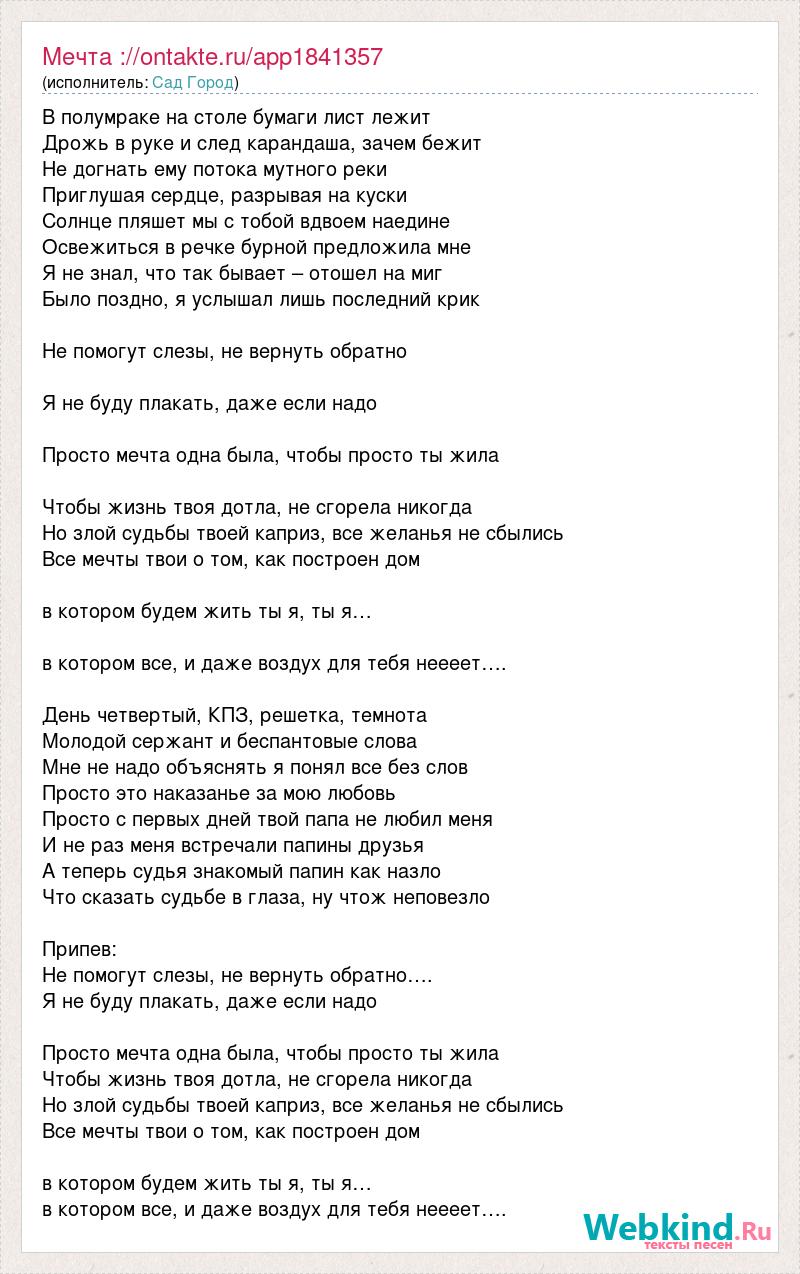 В полумраке на столе бумаги лист лежит Дрожь в руке и след карандаша, зачем бежит Не догнать ему потока мутного реки Приглушая сердце, разрывая на куски Солнце пляшет мы с тобой вдвоем наедине Освежиться в речке бурной предложила мне Я не знал, что так бывает – отошел на миг Было поздно, я услышал лишь последний крик Не помогут слезы, не вернуть обратно Я не буду плакать, даже если надо Просто мечта одна была, чтобы просто ты жила Чтобы жизнь твоя дотла, не сгорела никогда Но злой судьбы твоей каприз, все желанья не сбылись Все мечты твои о том, как построен дом в котором будем жить ты я, ты я… в котором все, и даже воздух для тебя неееет…. День четвертый, КПЗ, решетка, темнота Молодой сержант и беспантовые слова Мне не надо объяснять я понял все без слов Просто это наказанье за мою любовь Просто с первых дней твой папа не любил меня И не раз меня встречали папины друзья А теперь судья знакомый папин как назло Что сказать судьбе в глаза, ну чтож неповезло Припев: Не помогут слезы, не вернуть обратно…. Я не буду плакать, даже если надо Просто мечта одна была, чтобы просто ты жила Чтобы жизнь твоя дотла, не сгорела никогда Но злой судьбы твоей каприз, все желанья не сбылись Все мечты твои о том, как построен дом в котором будем жить ты я, ты я… в котором все, и даже воздух для тебя неееет….