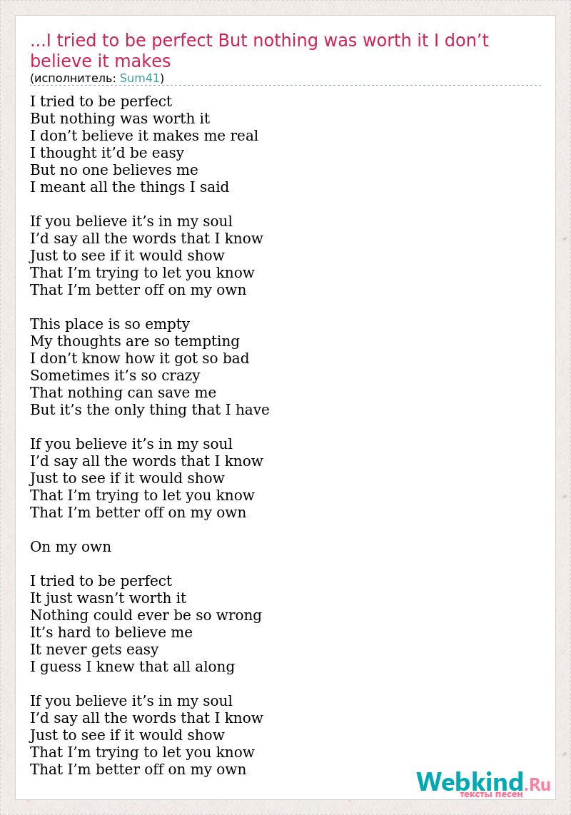 ...I tried to be perfect But nothing was worth it I don’t believe it m