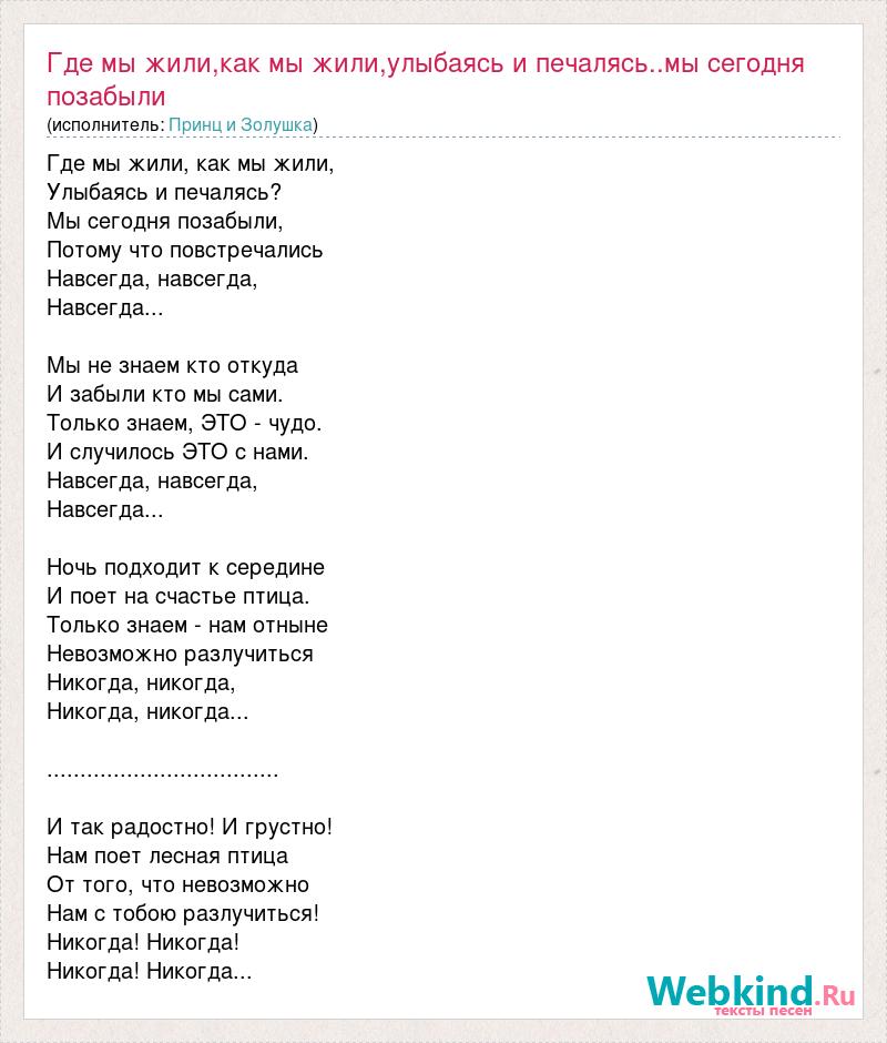 Главная→Исполнители→Принц и Золушка→Где мы жили,как мы жили,улыбаясь и печалясь..мы сегодня позабыли потому ,что пов