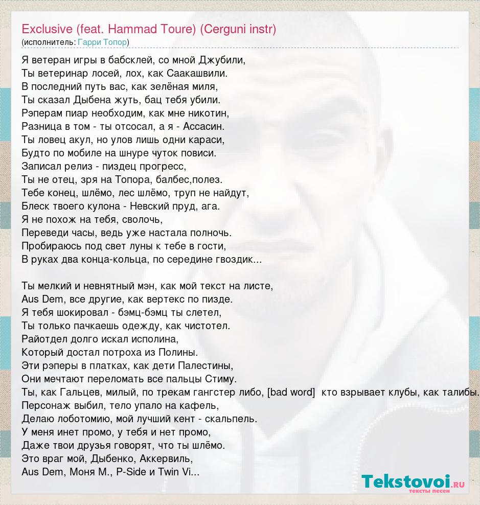 Я ветеран игры в бабсклей, со мной Джубили, Ты ветеринар лосей, лох, как Саакашвили. В последний путь вас, как зелёная миля, Ты сказал Дыбена жуть, бац тебя убили. Рэперам пиар необходим, как мне никотин, Разница в том - ты отсосал, а я - Ассасин. Ты ловец акул, но улов лишь одни караси, Будто по мобиле на шнуре чуток повиси. Записал релиз - пиздец прогресс, Ты не отец, зря на Топора, балбес,полез. Тебе конец, шлёмо, лес шлёмо, труп не найдут, Блеск твоего кулона - Невский пруд, ага. Я не похож на тебя, сволочь, Переведи часы, ведь уже настала полночь. Пробираюсь под свет луны к тебе в гости, В руках два конца-кольца, по середине гвоздик... Ты мелкий и невнятный мэн, как мой текст на листе, Aus Dem, все другие, как вертекс по пизде. Я тебя шокировал - бэмц-бэмц ты слетел, Ты только пачкаешь одежду, как чистотел. Райотдел долго искал исполина, Который достал потроха из Полины. Эти рэперы в платках, как дети Палестины, Они мечтают переломать все пальцы Стиму. Ты, как Гальцев, милый, по трекам гангстер либо, [bad word] кто взрывает клубы, как талибы. Персонаж выбил, тело упало на кафель, Делаю лоботомию, мой лучший кент - скальпель. У меня инет промо, у тебя и нет промо, Даже твои друзья говорят, что ты шлёмо. Это враг мой, Дыбенко, Аккервиль, Aus Dem, Моня М., P-Side и Twin Vi...