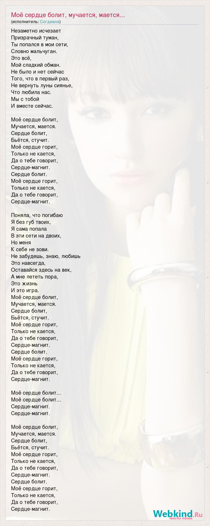 Незаметно исчезает Призрачный туман, Ты попался в мои сети, Словно мальчуган. Это всё, Мой сладкий обман. Не было и нет сейчас Того, что в первый раз, Не вернуть луны сиянье, Что любила нас. Мы с тобой И вместе сейчас. Моё сердце болит, Мучается, мается. Сердце болит, Бьётся, стучит. Моё сердце горит, Только не кается, Да о тебе говорит, Сердце-магнит. Сердце болит. Моё сердце горит, Только не кается, Да о тебе говорит, Сердце-магнит. Поняла, что погибаю Я без губ твоих, Я сама попала В эти сети на двоих, Но меня К себе не зови. Не забудешь, знаю, любишь Это навсегда, Оставайся здесь на век, А мне лететь пора, Это жизнь И это игра. Моё сердце болит, Мучается, мается. Сердце болит, Бьётся, стучит. Моё сердце горит, Только не кается, Да о тебе говорит, Сердце-магнит. Сердце болит. Моё сердце горит, Только не кается, Да о тебе говорит, Сердце-магнит. Моё сердце болит... Моё сердце болит... Сердце-магнит. Сердце-магнит. Моё сердце болит, Мучается, мается. Сердце болит, Бьётся, стучит. Моё сердце горит, Только не кается, Да о тебе говорит, Сердце-магнит. Сердце болит. Моё сердце горит, Только не кается, Да о тебе говорит, Сердце-магнит.