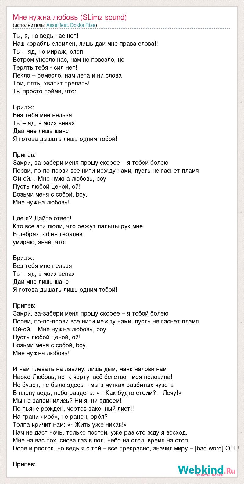 Ты, я, но ведь нас нет! Наш корабль сломлен, лишь дай мне права слова!! Ты – яд, но мираж, слеп! Ветром унесло нас, нам не повезло, но Терять тебя - сил нет! Пекло – ремесло, нам лета и ни слова Три, пять, хватит трепать! Ты просто пойми, что: Бридж: Без тебя мне нельзя Ты – яд, в моих венах Дай мне лишь шанс Я готова дышать лишь одним тобой! Припев: Замри, за-забери меня прошу скорее – я тобой болею Порви, по-по-порви все нити между нами, пусть не гаснет пламя Ой-ой… Мне нужна любовь, boy Пусть любой ценой, ой! Возьми меня с собой, boy, Мне нужна любовь! Где я? Дайте ответ! Кто все эти люди, что режут пальцы рук мне В дебрях, «die» терапевт умираю, знай, что: Бридж: Без тебя мне нельзя Ты – яд, в моих венах Дай мне лишь шанс Я готова дышать лишь одним тобой! Припев: Замри, за-забери меня прошу скорее – я тобой болею Порви, по-по-порви все нити между нами, пусть не гаснет пламя Ой-ой… Мне нужна любовь, boy Пусть любой ценой, ой! Возьми меня с собой, boy, Мне нужна любовь! И нам плевать на лавину, лишь дым, маяк налови нам Нарко-Любовь, но к черту всё бегство, моя половина! Не будет, не было здесь – мы в мутках разбитых чувств В плену ведь, небо раздеть: « - Как будто стоим? – Лечу!» Мы не запомнились? Ни я, ни вдвоем! По пьяне рожден, чертов законный лист!! На грани «моё», не ранен, орёл? Толпа кричит нам: «- Жить уже никак!» Нам не даст ночь, только постой, уже раз сто жду я восход, Мне на вас пох, снова газ в пол, небо на стол, время на стоп, Dope и росток, но ведь я с той – все прекрасно, значит миру – [bad word] OFF! Припев: