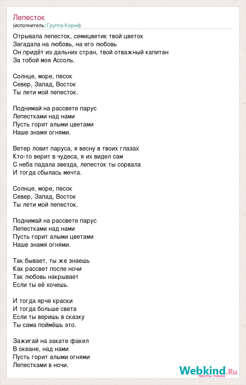 Отрывала лепесток, семицветик твой цветок Загадала на любовь, на его любовь Он придёт из дальних стран, твой отважный капитан За тобой моя Ассоль. Солнце, море, песок Север, Запад, Восток Ты лети мой лепесток. Поднимай на рассвете парус Лепестками над нами Пусть горит алыми цветами Наше знамя огнями. Ветер ловит паруса, я весну в твоих глазах Кто-то верит в чудеса, я их видел сам С неба падала звезда, лепесток ты сорвала И тогда сбылась мечта. Солнце, море, песок Север, Запад, Восток Ты лети мой лепесток. Поднимай на рассвете парус Лепестками над нами Пусть горит алыми цветами Наше знамя огнями. Так бывает, ты же знаешь Как рассвет после ночи Так любовь накрывает Если ты её хочешь. И тогда ярче краски И тогда больше света Если ты веришь в сказку Ты сама поймёшь это. Зажигай на закате факел В океане, над нами Пусть горит алыми огнями Лепестками в ночи.
