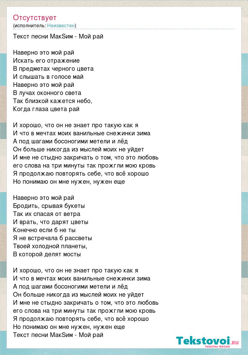 Текст песни МакSим - Мой рай Наверно это мой рай Искать его отражение В предметах черного цвета И слышать в голосе май Наверно это мой рай В лучах оконного света Так близкой кажется небо, Когда глаза цвета рай И хорошо, что он не знает про такую как я И что в мечтах моих ванильные снежинки зима А под шагами босоногими метели и лёд Он больше никогда из мыслей моих не уйдет И мне не стыдно закричать о том, что это любовь его слова на три минуты так прожгли мою кровь Я продолжаю повторять себе, что всё хорошо Но понимаю он мне нужен, нужен еще Наверно это мой рай Бродить, срывая букеты Так их спасая от ветра И врать, что дарят цветы Конечно если б не ты Я не встречала б рассветы Твоей холодной планеты, В которой делят мосты И хорошо, что он не знает про такую как я И что в мечтах моих ванильные снежинки зима А под шагами босоногими метели и лёд Он больше никогда из мыслей моих не уйдет И мне не стыдно закричать о том, что это любовь его слова на три минуты так прожгли мою кровь Я продолжаю повторять себе, что всё хорошо Но понимаю он мне нужен, нужен еще Текст песни МакSим - Мой рай