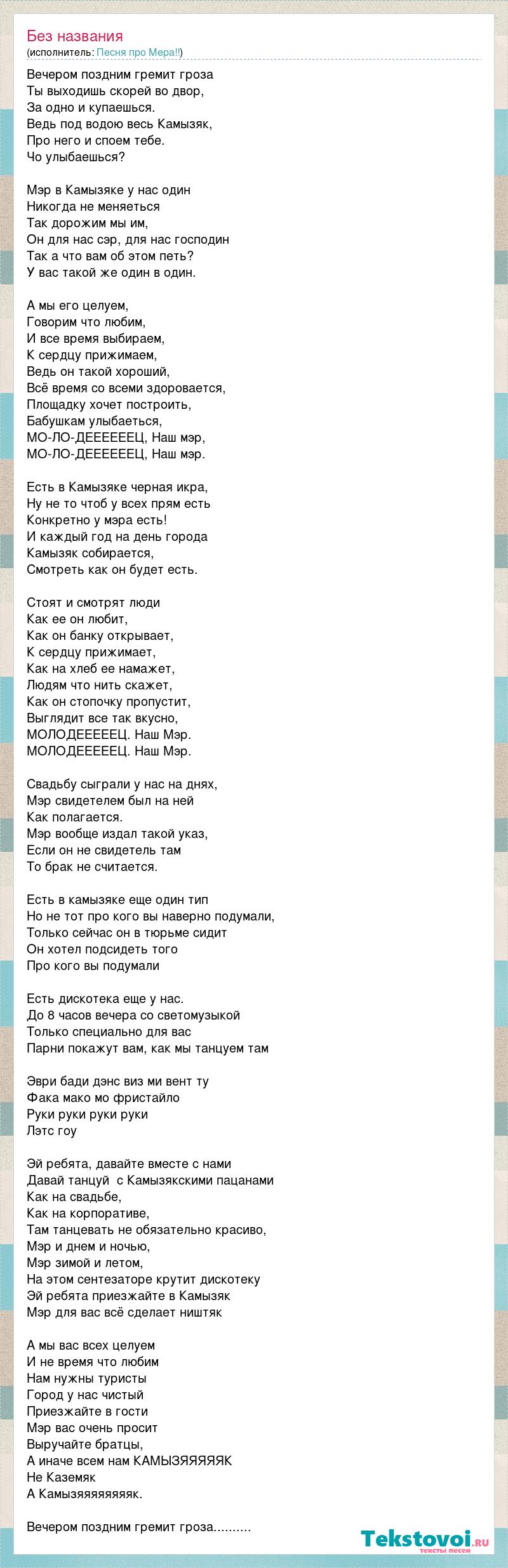 Вечером поздним гремит гроза Ты выходишь скорей во двор, За одно и купаешься. Ведь под водою весь Камызяк, Про него и споем тебе. Чо улыбаешься? Мэр в Камызяке у нас один Никогда не меняеться Так дорожим мы им, Он для нас сэр, для нас господин Так а что вам об этом петь? У вас такой же один в один. А мы его целуем, Говорим что любим, И все время выбираем, К сердцу прижимаем, Ведь он такой хороший, Всё время со всеми здоровается, Площадку хочет построить, Бабушкам улыбаеться, МО-ЛО-ДЕЕЕЕЕЕЦ, Наш мэр, МО-ЛО-ДЕЕЕЕЕЕЦ, Наш мэр. Есть в Камызяке черная икра, Ну не то чтоб у всех прям есть Конкретно у мэра есть! И каждый год на день города Камызяк собирается, Смотреть как он будет есть. Стоят и смотрят люди Как ее он любит, Как он банку открывает, К сердцу прижимает, Как на хлеб ее намажет, Людям что нить скажет, Как он стопочку пропустит, Выглядит все так вкусно, МОЛОДЕЕЕЕЕЦ. Наш Мэр. МОЛОДЕЕЕЕЕЦ. Наш Мэр. Свадьбу сыграли у нас на днях, Мэр свидетелем был на ней Как полагается. Мэр вообще издал такой указ, Если он не свидетель там То брак не считается. Есть в камызяке еще один тип Но не тот про кого вы наверно подумали, Только сейчас он в тюрьме сидит Он хотел подсидеть того Про кого вы подумали Есть дискотека еще у нас. До 8 часов вечера со светомузыкой Только специально для вас Парни покажут вам, как мы танцуем там Эври бади дэнс виз ми вент ту Фака мако мо фристайло Руки руки руки руки Лэтс гоу Эй ребята, давайте вместе с нами Давай танцуй с Камызякскими пацанами Как на свадьбе, Как на корпоративе, Там танцевать не обязательно красиво, Мэр и днем и ночью, Мэр зимой и летом, На этом сентезаторе крутит дискотеку Эй ребята приезжайте в Камызяк Мэр для вас всё сделает ништяк А мы вас всех целуем И не время что любим Нам нужны туристы Город у нас чистый Приезжайте в гости Мэр вас очень просит Выручайте братцы, А иначе всем нам КАМЫЗЯЯЯЯЯК Не Каземяк А Камызяяяяяяяяк. Вечером поздним гремит гроза..........
