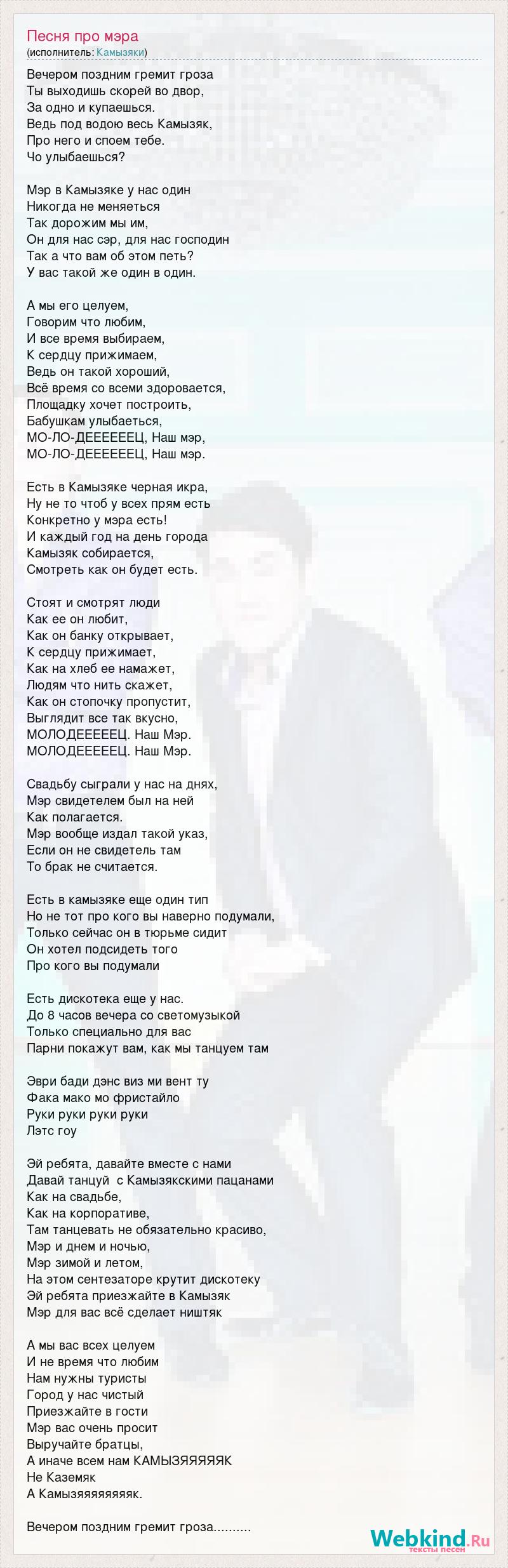 Вечером поздним гремит гроза Ты выходишь скорей во двор, За одно и купаешься. Ведь под водою весь Камызяк, Про него и споем тебе. Чо улыбаешься? Мэр в Камызяке у нас один Никогда не меняеться Так дорожим мы им, Он для нас сэр, для нас господин Так а что вам об этом петь? У вас такой же один в один. А мы его целуем, Говорим что любим, И все время выбираем, К сердцу прижимаем, Ведь он такой хороший, Всё время со всеми здоровается, Площадку хочет построить, Бабушкам улыбаеться, МО-ЛО-ДЕЕЕЕЕЕЦ, Наш мэр, МО-ЛО-ДЕЕЕЕЕЕЦ, Наш мэр. Есть в Камызяке черная икра, Ну не то чтоб у всех прям есть Конкретно у мэра есть! И каждый год на день города Камызяк собирается, Смотреть как он будет есть. Стоят и смотрят люди Как ее он любит, Как он банку открывает, К сердцу прижимает, Как на хлеб ее намажет, Людям что нить скажет, Как он стопочку пропустит, Выглядит все так вкусно, МОЛОДЕЕЕЕЕЦ. Наш Мэр. МОЛОДЕЕЕЕЕЦ. Наш Мэр. Свадьбу сыграли у нас на днях, Мэр свидетелем был на ней Как полагается. Мэр вообще издал такой указ, Если он не свидетель там То брак не считается. Есть в камызяке еще один тип Но не тот про кого вы наверно подумали, Только сейчас он в тюрьме сидит Он хотел подсидеть того Про кого вы подумали Есть дискотека еще у нас. До 8 часов вечера со светомузыкой Только специально для вас Парни покажут вам, как мы танцуем там Эври бади дэнс виз ми вент ту Фака мако мо фристайло Руки руки руки руки Лэтс гоу Эй ребята, давайте вместе с нами Давай танцуй с Камызякскими пацанами Как на свадьбе, Как на корпоративе, Там танцевать не обязательно красиво, Мэр и днем и ночью, Мэр зимой и летом, На этом сентезаторе крутит дискотеку Эй ребята приезжайте в Камызяк Мэр для вас всё сделает ништяк А мы вас всех целуем И не время что любим Нам нужны туристы Город у нас чистый Приезжайте в гости Мэр вас очень просит Выручайте братцы, А иначе всем нам КАМЫЗЯЯЯЯЯК Не Каземяк А Камызяяяяяяяяк. Вечером поздним гремит гроза..........