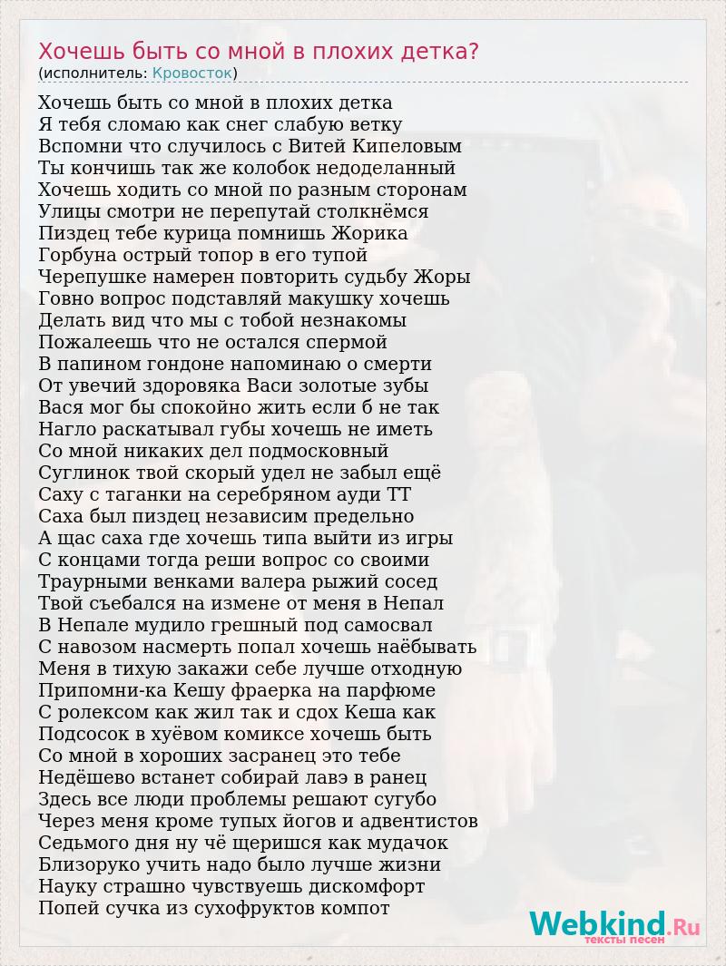 Хочешь быть со мной в плохих детка Я тебя сломаю как снег слабую ветку Вспомни что случилось с Витей Кипеловым Ты кончишь так же колобок недоделанный Хочешь ходить со мной по разным сторонам Улицы смотри не перепутай столкнёмся Пиздец тебе курица помнишь Жорика Горбуна острый топор в его тупой Черепушке намерен повторить судьбу Жоры Говно вопрос подставляй макушку хочешь Делать вид что мы с тобой незнакомы Пожалеешь что не остался спермой В папином гондоне напоминаю о смерти От увечий здоровяка Васи золотые зубы Вася мог бы спокойно жить если б не так Нагло раскатывал губы хочешь не иметь Со мной никаких дел подмосковный Суглинок твой скорый удел не забыл ещё Саху с таганки на серебряном ауди ТТ Саха был пиздец независим предельно А щас саха где хочешь типа выйти из игры С концами тогда реши вопрос со своими Траурными венками валера рыжий сосед Твой съебался на измене от меня в Непал В Непале мудило грешный под самосвал С навозом насмерть попал хочешь наёбывать Меня в тихую закажи себе лучше отходную Припомни-ка Кешу фраерка на парфюме С ролексом как жил так и сдох Кеша как Подсосок в хуёвом комиксе хочешь быть Со мной в хороших засранец это тебе Недёшево встанет собирай лавэ в ранец Здесь все люди проблемы решают сугубо Через меня кроме тупых йогов и адвентистов Седьмого дня ну чё щеришся как мудачок Близоруко учить надо было лучше жизни Науку страшно чувствуешь дискомфорт Попей сучка из сухофруктов компот