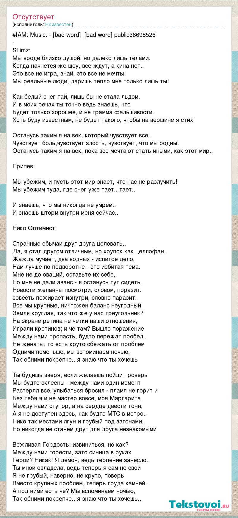 #IAM: Music. - [bad word] [bad word] public38698526 - SLimz: Мы вроде близко душой, но далеко лишь телами. Когда начнется же шоу, все ждут, а кина нет.. Это все не игра, знай, это все не мечты: Мы реальные люди, даришь тепло мне только лишь ты! Как белый снег тай, лишь бы не стала льдом, И в моих речах ты точно ведь знаешь, что Будет только хорошее, и не грамма фальшивости. Хоть буду известным, не будет такого, чтобы на вершине я стих! Останусь таким я на век, который чувствует все.. Чувствует боль,чувствует злость, чувствует, что мы родны. Останусь таким я на век, пока все мечтают стать иными, как этот мир.. Припев: Мы убежим, и пусть этот мир знает, что нас не разлучить! Мы убежим туда, где снег уже тает.. тает.. И знаешь, что мы никогда не умрем.. И знаешь шторм внутри меня сейчас.. Нико Оптимист: Странные обычаи друг друга целовать.. Да, я стал другом отличным, но хрупок как целлофан. Жажда мучает, два водных - испитое дело, Нам лучше по подворотне - это избитая тема. Мне не до оваций, оставьте их себе, Но мне не дали аванс - я останусь тут сидеть. Новости желанны посмотри, словом, поразит. совесть пожирает изнутри, словно паразит. Все мы крупные, ничтожен баланс неугодный Земля круглая, так что же у нас треугольник? На экране ретина не четки наши отношения, Играли кретинов; и че там? Вышло поражение Между нами пропасть, будто пережат пробел.. Не женаты, то есть круто сбежать от проблем Одними поменьше, мы вспоминаем ночью, Так обними покрепче.. я знаю что ты хочешь Ты будишь зверя, если желаешь пойди проверь Мы будто склеены - между нами один момент Растерял все, улыбаться бросил - пламя не горит и Без тебя я и не мастер вовсе, моя Маргарита Между нами ступор, а на сердце двести тонн, А я не доступен здесь, как будто МТС в метро.. Нико так местами лгун и грубый под загонами, Но никогда не станем друг для друга незнакомыми Вежливая Гордость: извиниться, но как? Между нами горести, зато синица в руках Герои? Никак! Я демон, ведь терпение занесло.. Ты мной овладела, ведь теперь я сам не свой Я не грубый, наверно, не круто, поверь Вместо крупных проблем, теперь груда камней.. А под ними есть че? Мы вспоминаем ночью, Так обними покрепче.. я знаю что ты хочешь..