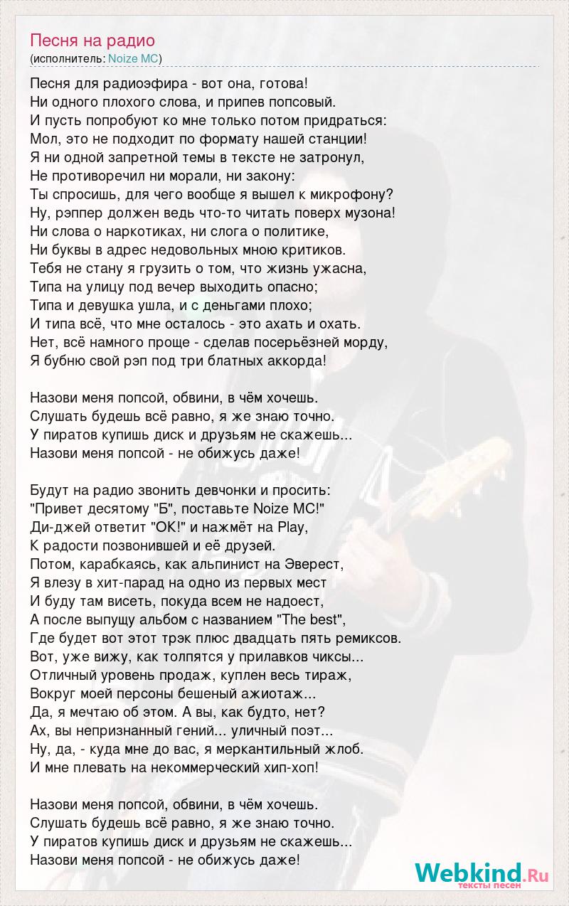 Песня для радиоэфира - вот она, готова! Ни одного плохого слова, и припев попсовый. И пусть попробуют ко мне только потом придраться: Мол, это не подходит по формату нашей станции! Я ни одной запретной темы в тексте не затронул, Не противоречил ни морали, ни закону: Ты спросишь, для чего вообще я вышел к микрофону? Ну, рэппер должен ведь что-то читать поверх музона! Ни слова о наркотиках, ни слога о политике, Ни буквы в адрес недовольных мною критиков. Тебя не стану я грузить о том, что жизнь ужасна, Типа на улицу под вечер выходить опасно; Типа и девушка ушла, и с деньгами плохо; И типа всё, что мне осталось - это ахать и охать. Нет, всё намного проще - сделав посерьёзней морду, Я бубню свой рэп под три блатных аккорда! Назови меня попсой, обвини, в чём хочешь. Слушать будешь всё равно, я же знаю точно. У пиратов купишь диск и друзьям не скажешь... Назови меня попсой - не обижусь даже! Будут на радио звонить девчонки и просить: "Привет десятому "Б", поставьте Noize MC!" Ди-джей ответит "ОК!" и нажмёт на Play, К радости позвонившей и её друзей. Потом, карабкаясь, как альпинист на Эверест, Я влезу в хит-парад на одно из первых мест И буду там висеть, покуда всем не надоест, А после выпущу альбом с названием "The best", Где будет вот этот трэк плюс двадцать пять ремиксов. Вот, уже вижу, как толпятся у прилавков чиксы... Отличный уровень продаж, куплен весь тираж, Вокруг моей персоны бешеный ажиотаж... Да, я мечтаю об этом. А вы, как будто, нет? Ах, вы непризнанный гений... уличный поэт... Ну, да, - куда мне до вас, я меркантильный жлоб. И мне плевать на некоммерческий хип-хоп! Назови меня попсой, обвини, в чём хочешь. Слушать будешь всё равно, я же знаю точно. У пиратов купишь диск и друзьям не скажешь... Назови меня попсой - не обижусь даже!