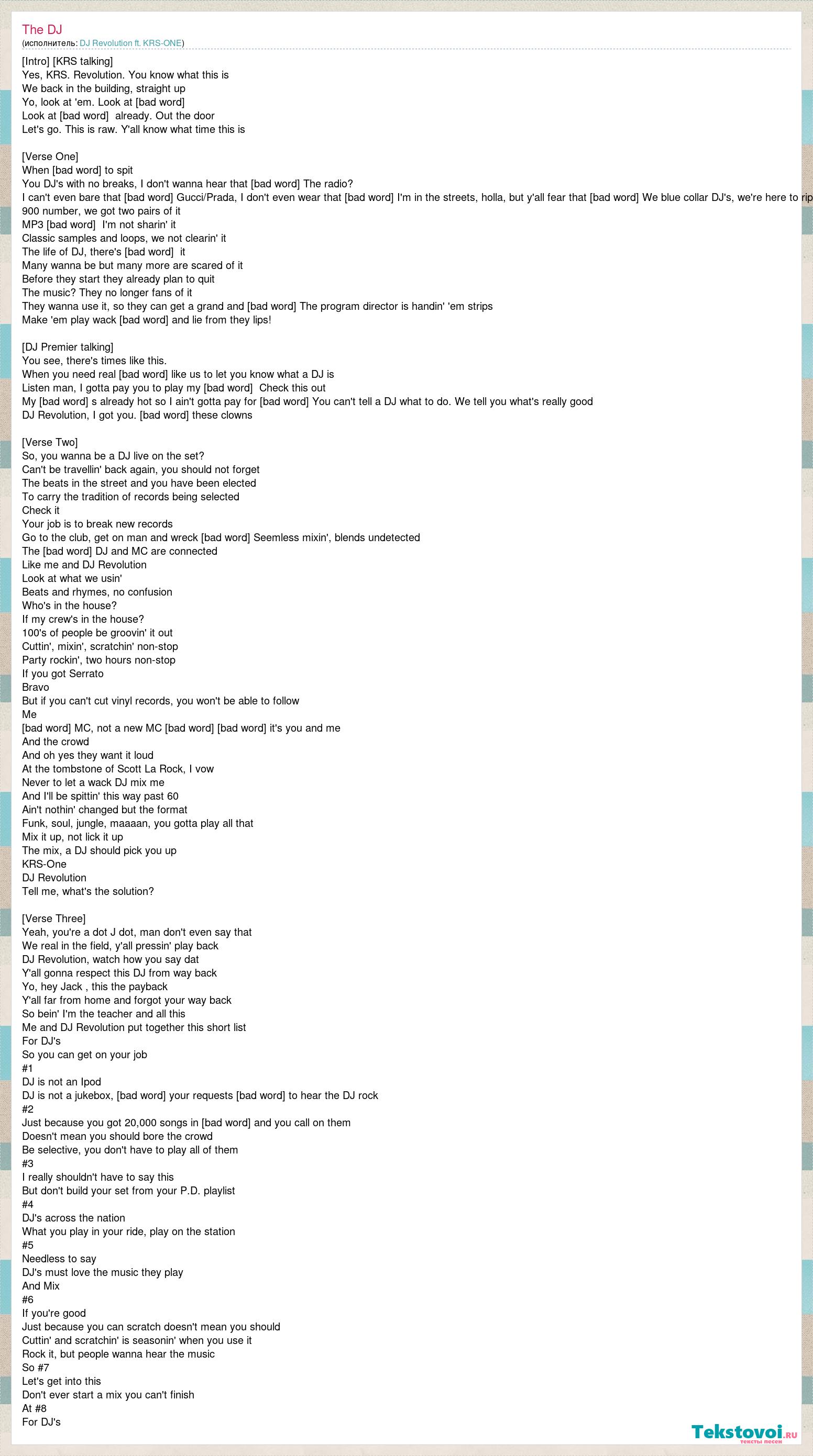 [Intro] [KRS talking] Yes, KRS. Revolution. You know what this is We back in the building, straight up Yo, look at 'em. Look at 'em runnin' Look at 'em runnin' already. Out the door Let's go. This is raw. Y'all know what time this is [Verse One] When KRS-One comes to spit You DJ's with no breaks, I don't wanna hear that [bad word] The radio? I can't even bare that [bad word] Gucci/Prada, I don't even wear that [bad word] I'm in the streets, holla, but y'all fear that [bad word] We blue collar DJ's, we're here to rip 900 number, we got two pairs of it MP3 [bad word] I'm not sharin' it Classic samples and loops, we not clearin' it The life of DJ, there's no comparin' it Many wanna be but many more are scared of it Before they start they already plan to quit The music? They no longer fans of it They wanna use it, so they can get a grand and [bad word] The program director is handin' 'em strips Make 'em play wack [bad word] and lie from they lips! [DJ Premier talking] You see, there's times like this. When you need real [bad word] like us to let you know what a DJ is Listen man, I gotta pay you to play my [bad word] Check this out My [bad word] s already hot so I ain't gotta pay for [bad word] You can't tell a DJ what to do. We tell you what's really good DJ Revolution, I got you. [bad word] these clowns [Verse Two] So, you wanna be a DJ live on the set? Can't be travellin' back again, you should not forget The beats in the street and you have been elected To carry the tradition of records being selected Check it Your job is to break new records Go to the club, get on man and wreck [bad word] Seemless mixin', blends undetected The true DJ and MC are connected Like me and DJ Revolution Look at what we usin' Beats and rhymes, no confusion Who's in the house? If my crew's in the house? 100's of people be groovin' it out Cuttin', mixin', scratchin' non-stop Party rockin', two hours non-stop If you got Serrato Bravo But if you can't cut vinyl records, you won't be able to follow Me true MC, not a new MC [bad word] the computer it's you and me And the crowd And oh yes they want it loud At the tombstone of Scott La Rock, I vow Never to let a wack DJ mix me And I'll be spittin' this way past 60 Ain't nothin' changed but the format Funk, soul, jungle, maaaan, you gotta play all that Mix it up, not lick it up The mix, a DJ should pick you up KRS-One DJ Revolution Tell me, what's the solution? [Verse Three] Yeah, you're a dot J dot, man don't even say that We real in the field, y'all pressin' play back DJ Revolution, watch how you say dat Y'all gonna respect this DJ from way back Yo, hey Jack , this the payback Y'all far from home and forgot your way back So bein' I'm the teacher and all this Me and DJ Revolution put together this short list For DJ's So you can get on your job #1 DJ is not an Ipod DJ is not a jukebox, [bad word] your requests You come to hear the DJ rock #2 Just because you got 20,000 songs in your computer and you call on them Doesn't mean you should bore the crowd Be selective, you don't have to play all of them #3 I really shouldn't have to say this But don't build your set from your P.D. playlist #4 DJ's across the nation What you play in your ride, play on the station #5 Needless to say DJ's must love the music they play And Mix #6 If you're good Just because you can scratch doesn't mean you should Cuttin' and scratchin' is seasonin' when you use it Rock it, but people wanna hear the music So #7 Let's get into this Don't ever start a mix you can't finish At #8 For DJ's