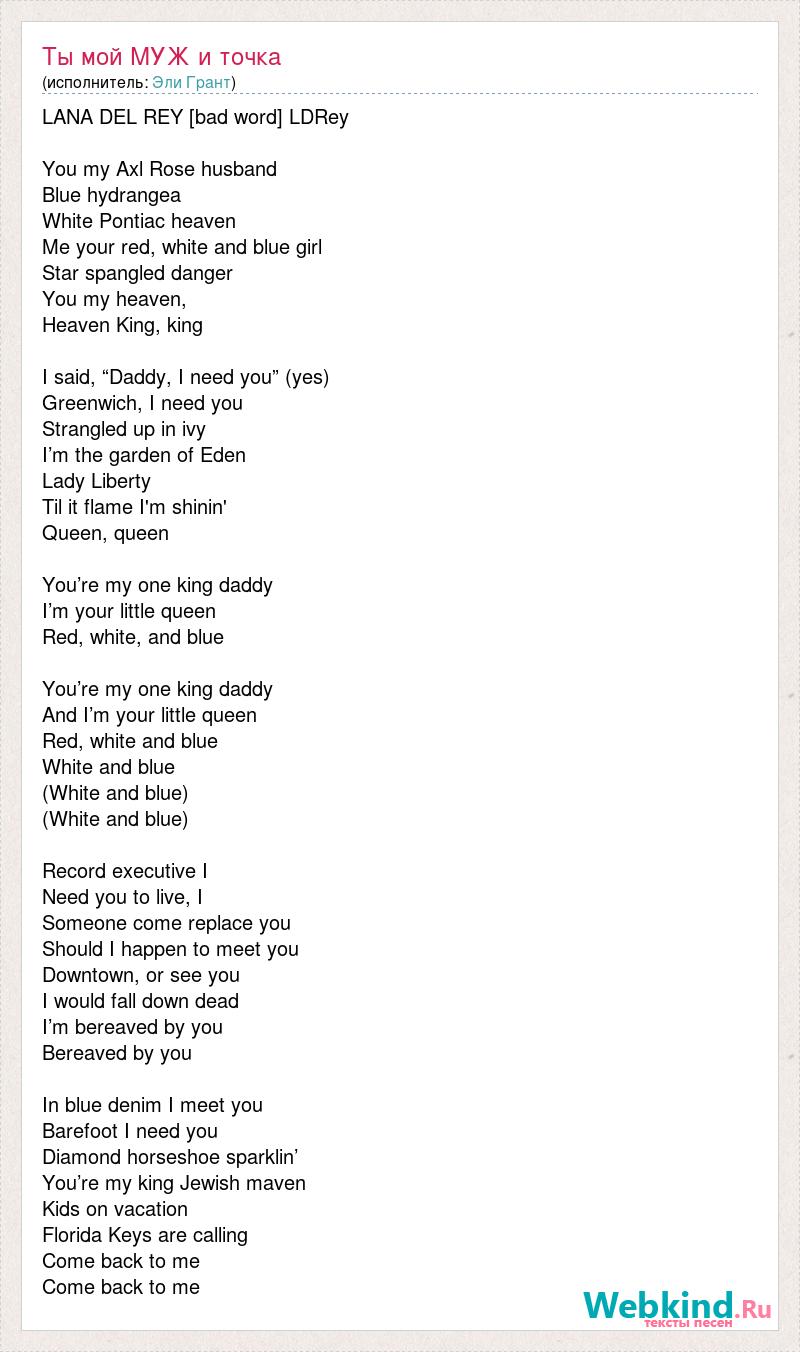 LANA DEL REY [bad word] LDRey You my Axl Rose husband Blue hydrangea White Pontiac heaven Me your red, white and blue girl Star spangled danger You my heaven, Heaven King, king I said, “Daddy, I need you” (yes) Greenwich, I need you Strangled up in ivy I’m the garden of Eden Lady Liberty Til it flame I'm shinin' Queen, queen You’re my one king daddy I’m your little queen Red, white, and blue You’re my one king daddy And I’m your little queen Red, white and blue White and blue (White and blue) (White and blue) Record executive I Need you to live, I Someone come replace you Should I happen to meet you Downtown, or see you I would fall down dead I’m bereaved by you Bereaved by you In blue denim I meet you Barefoot I need you Diamond horseshoe sparklin’ You’re my king Jewish maven Kids on vacation Florida Keys are calling Come back to me Come back to me