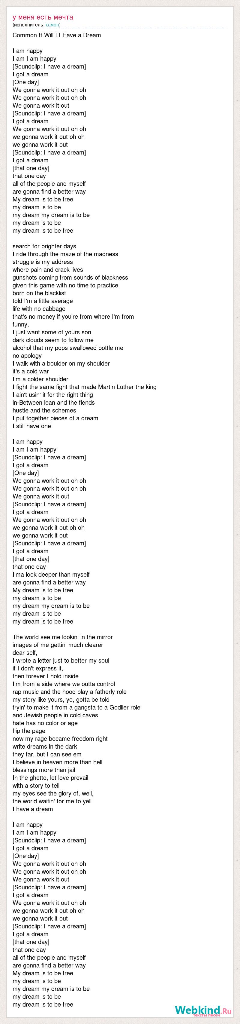 Common ft.Will.I.I Have a Dream I am happy I am I am happy [Soundclip: I have a dream] I got a dream [One day] We gonna work it out oh oh We gonna work it out oh oh We gonna work it out [Soundclip: I have a dream] I got a dream We gonna work it out oh oh we gonna work it out oh oh we gonna work it out [Soundclip: I have a dream] I got a dream [that one day] that one day all of the people and myself are gonna find a better way My dream is to be free my dream is to be my dream my dream is to be my dream is to be my dream is to be free search for brighter days I ride through the maze of the madness struggle is my address where pain and crack lives gunshots coming from sounds of blackness given this game with no time to practice born on the blacklist told I'm a little average life with no cabbage that's no money if you're from where I'm from funny, I just want some of yours son dark clouds seem to follow me alcohol that my pops swallowed bottle me no apology I walk with a boulder on my shoulder it's a cold war I'm a colder shoulder I fight the same fight that made Martin Luther the king I ain't usin' it for the right thing in-Between lean and the fiends hustle and the schemes I put together pieces of a dream I still have one I am happy I am I am happy [Soundclip: I have a dream] I got a dream [One day] We gonna work it out oh oh We gonna work it out oh oh We gonna work it out [Soundclip: I have a dream] I got a dream We gonna work it out oh oh we gonna work it out oh oh we gonna work it out [Soundclip: I have a dream] I got a dream [that one day] that one day I'ma look deeper than myself are gonna find a better way My dream is to be free my dream is to be my dream my dream is to be my dream is to be my dream is to be free The world see me lookin' in the mirror images of me gettin' much clearer dear self, I wrote a letter just to better my soul if I don't express it, then forever I hold inside I'm from a side where we outta control rap music and the hood play a fatherly role my story like yours, yo, gotta be told tryin' to make it from a gangsta to a Godlier role and Jewish people in cold caves hate has no color or age flip the page now my rage became freedom right write dreams in the dark they far, but I can see em I believe in heaven more than hell blessings more than jail In the ghetto, let love prevail with a story to tell my eyes see the glory of, well, the world waitin' for me to yell I have a dream I am happy I am I am happy [Soundclip: I have a dream] I got a dream [One day] We gonna work it out oh oh We gonna work it out oh oh We gonna work it out [Soundclip: I have a dream] I got a dream We gonna work it out oh oh we gonna work it out oh oh we gonna work it out [Soundclip: I have a dream] I got a dream [that one day] that one day all of the people and myself are gonna find a better way My dream is to be free my dream is to be my dream my dream is to be my dream is to be my dream is to be free