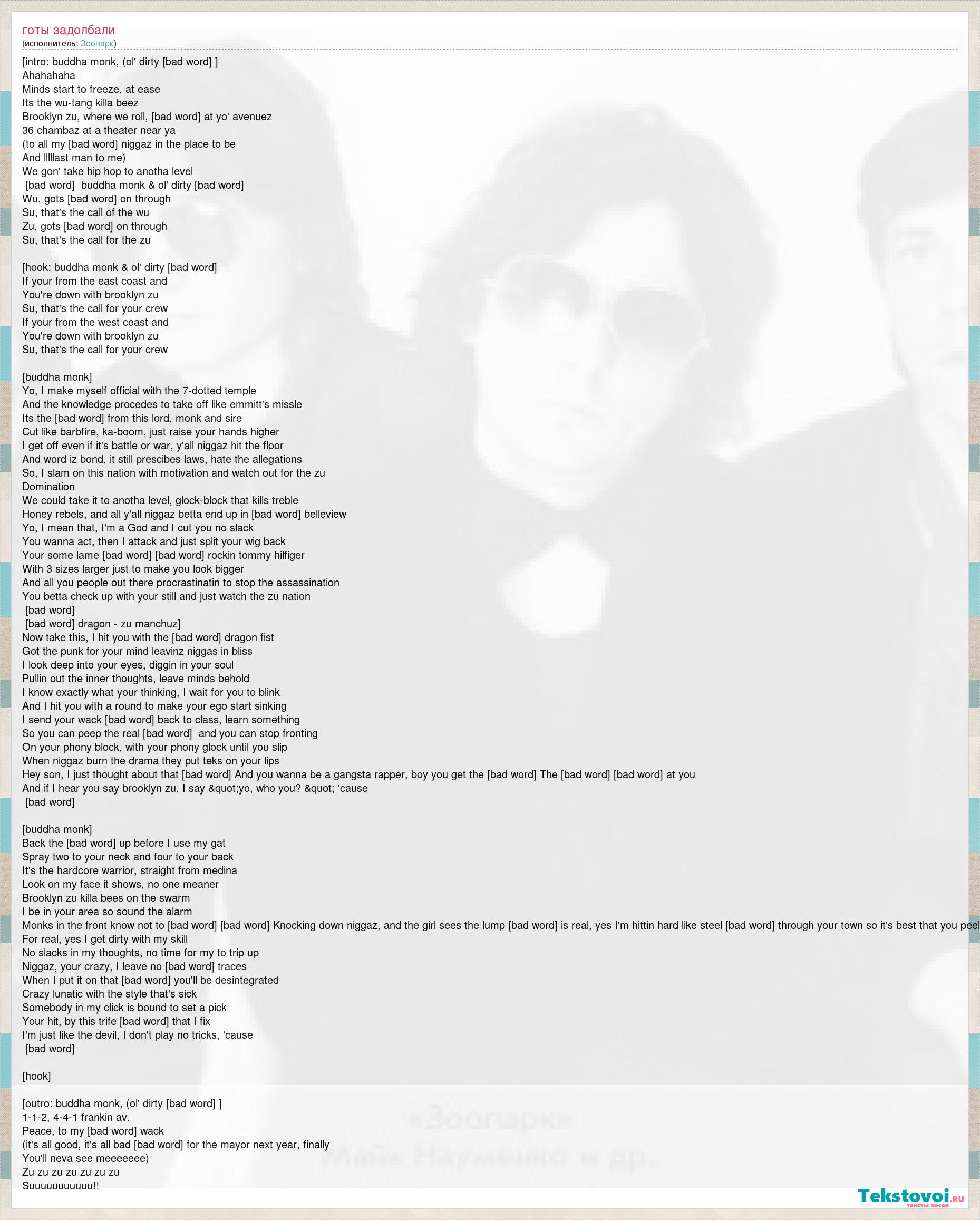 [intro: buddha monk, (ol' dirty [bad word] ] Ahahahaha Minds start to freeze, at ease Its the wu-tang killa beez Brooklyn zu, where we roll, manchuz Comin at yo' avenuez 36 chambaz at a theater near ya (to all my [bad word] niggaz in the place to be And lllllast man to me) We gon' take hip hop to anotha level [chorus: buddha monk & ol' dirty [bad word] Wu, gots like come on through Su, that's the call of the wu Zu, gots like come on through Su, that's the call for the zu [hook: buddha monk & ol' dirty [bad word] If your from the east coast and You're down with brooklyn zu Su, that's the call for your crew If your from the west coast and You're down with brooklyn zu Su, that's the call for your crew [buddha monk] Yo, I make myself official with the 7-dotted temple And the knowledge procedes to take off like emmitt's missle Its the rapfire comin from this lord, monk and sire Cut like barbfire, ka-boom, just raise your hands higher I get off even if it's battle or war, y'all niggaz hit the floor And word iz bond, it still prescibes laws, hate the allegations So, I slam on this nation with motivation and watch out for the zu Domination We could take it to anotha level, glock-block that kills treble Honey rebels, and all y'all niggaz betta end up in [bad word] belleview Yo, I mean that, I'm a God and I cut you no slack You wanna act, then I attack and just split your wig back Your some lame [bad word] [bad word] rockin tommy hilfiger With 3 sizes larger just to make you look bigger And all you people out there procrastinatin to stop the assassination You betta check up with your still and just watch the zu nation [chorus] [drunken dragon - zu manchuz] Now take this, I hit you with the drunken dragon fist Got the punk for your mind leavinz niggas in bliss I look deep into your eyes, diggin in your soul Pullin out the inner thoughts, leave minds behold I know exactly what your thinking, I wait for you to blink And I hit you with a round to make your ego start sinking I send your wack [bad word] back to class, learn something So you can peep the real [bad word] and you can stop fronting On your phony block, with your phony glock until you slip When niggaz burn the drama they put teks on your lips Hey son, I just thought about that [bad word] And you wanna be a gangsta rapper, boy you get the [bad word] The drunken dragon, comin at you And if I hear you say brooklyn zu, I say "yo, who you? " 'cause [chorus] [buddha monk] Back the [bad word] up before I use my gat Spray two to your neck and four to your back It's the hardcore warrior, straight from medina Look on my face it shows, no one meaner Brooklyn zu killa bees on the swarm I be in your area so sound the alarm Monks in the front know not to [bad word] drunk Knocking down niggaz, and the girl sees the lump [bad word] is real, yes I'm hittin hard like steel I'm comin through your town so it's best that you peel For real, yes I get dirty with my skill No slacks in my thoughts, no time for my to trip up Niggaz, your crazy, I leave no [bad word] traces When I put it on that [bad word] you'll be desintegrated Crazy lunatic with the style that's sick Somebody in my click is bound to set a pick Your hit, by this trife [bad word] that I fix I'm just like the devil, I don't play no tricks, 'cause [chorus] [hook] [outro: buddha monk, (ol' dirty [bad word] ] 1-1-2, 4-4-1 frankin av. Peace, to my [bad word] wack (it's all good, it's all bad Dirty runs for the mayor next year, finally You'll neva see meeeeeee) Zu zu zu zu zu zu zu Suuuuuuuuuuu!!