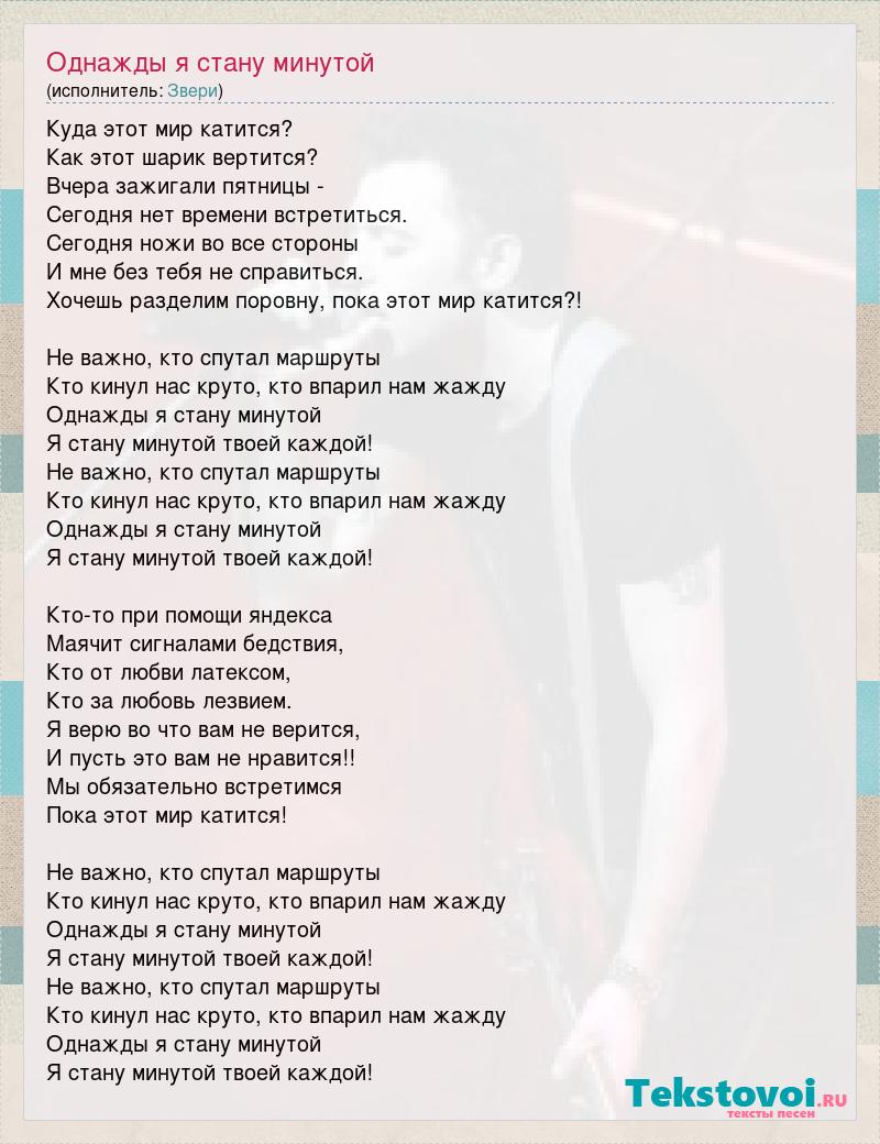Куда этот мир катится? Как этот шарик вертится? Вчера зажигали пятницы - Сегодня нет времени встретиться. Сегодня ножи во все стороны И мне без тебя не справиться. Хочешь разделим поровну, пока этот мир катится?! Не важно, кто спутал маршруты Кто кинул нас круто, кто впарил нам жажду Однажды я стану минутой Я стану минутой твоей каждой! Не важно, кто спутал маршруты Кто кинул нас круто, кто впарил нам жажду Однажды я стану минутой Я стану минутой твоей каждой! Кто-то при помощи яндекса Маячит сигналами бедствия, Кто от любви латексом, Кто за любовь лезвием. Я верю во что вам не верится, И пусть это вам не нравится!! Мы обязательно встретимся Пока этот мир катится! Не важно, кто спутал маршруты Кто кинул нас круто, кто впарил нам жажду Однажды я стану минутой Я стану минутой твоей каждой! Не важно, кто спутал маршруты Кто кинул нас круто, кто впарил нам жажду Однажды я стану минутой Я стану минутой твоей каждой!