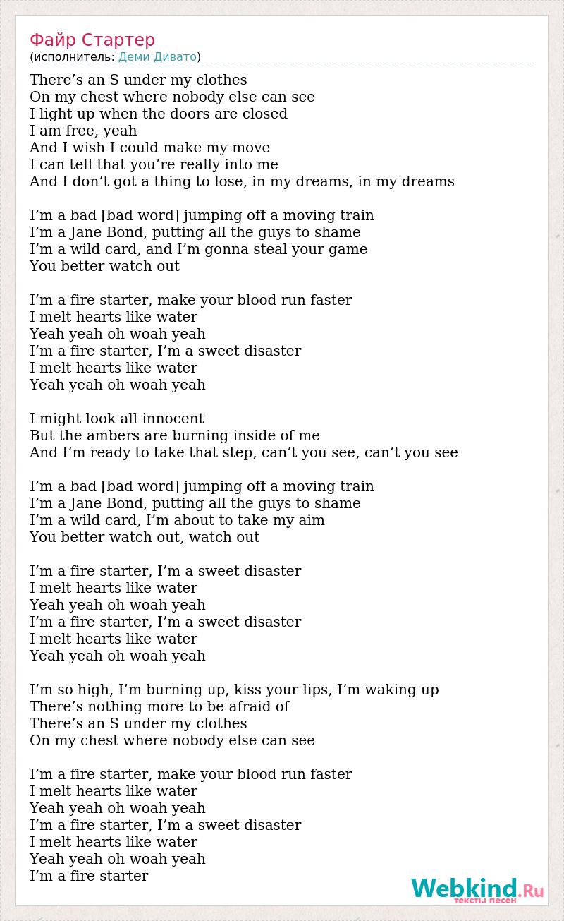 There’s an S under my clothes On my chest where nobody else can see I light up when the doors are closed I am free, yeah And I wish I could make my move I can tell that you’re really into me And I don’t got a thing to lose, in my dreams, in my dreams I’m a bad [bad word] jumping off a moving train I’m a Jane Bond, putting all the guys to shame I’m a wild card, and I’m gonna steal your game You better watch out I’m a fire starter, make your blood run faster I melt hearts like water Yeah yeah oh woah yeah I’m a fire starter, I’m a sweet disaster I melt hearts like water Yeah yeah oh woah yeah I might look all innocent But the ambers are burning inside of me And I’m ready to take that step, can’t you see, can’t you see I’m a bad [bad word] jumping off a moving train I’m a Jane Bond, putting all the guys to shame I’m a wild card, I’m about to take my aim You better watch out, watch out I’m a fire starter, I’m a sweet disaster I melt hearts like water Yeah yeah oh woah yeah I’m a fire starter, I’m a sweet disaster I melt hearts like water Yeah yeah oh woah yeah I’m so high, I’m burning up, kiss your lips, I’m waking up There’s nothing more to be afraid of There’s an S under my clothes On my chest where nobody else can see I’m a fire starter, make your blood run faster I melt hearts like water Yeah yeah oh woah yeah I’m a fire starter, I’m a sweet disaster I melt hearts like water Yeah yeah oh woah yeah I’m a fire starter