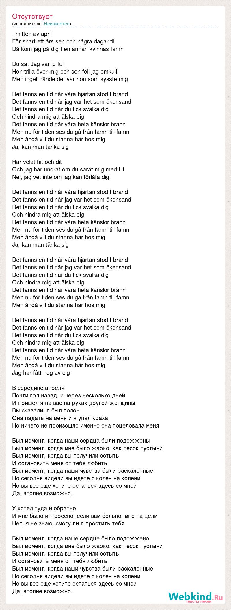 I mitten av april För snart ett års sen och några dagar till Då kom jag på dig I en annan kvinnas famn Du sa: Jag var ju full Hon trilla över mig och sen föll jag omkull Men inget hände det var hon som kysste mig Det fanns en tid när våra hjärtan stod I brand Det fanns en tid när jag var het som ökensand Det fanns en tid när du fick svalka dig Och hindra mig att älska dig Det fanns en tid när våra heta känslor brann Men nu för tiden ses du gå från famn till famn Men ändå vill du stanna här hos mig Ja, kan man tänka sig Har velat hit och dit Och jag har undrat om du sårat mig med flit Nej, jag vet inte om jag kan förlåta dig Det fanns en tid när våra hjärtan stod I brand Det fanns en tid när jag var het som ökensand Det fanns en tid när du fick svalka dig Och hindra mig att älska dig Det fanns en tid när våra heta känslor brann Men nu för tiden ses du gå från famn till famn Men ändå vill du stanna här hos mig Ja, kan man tänka sig Det fanns en tid när våra hjärtan stod I brand Det fanns en tid när jag var het som ökensand Det fanns en tid när du fick svalka dig Och hindra mig att älska dig Det fanns en tid när våra heta känslor brann Men nu för tiden ses du gå från famn till famn Men ändå vill du stanna här hos mig Det fanns en tid när våra hjärtan stod I brand Det fanns en tid när jag var het som ökensand Det fanns en tid när du fick svalka dig Och hindra mig att älska dig Det fanns en tid när våra heta känslor brann Men nu för tiden ses du gå från famn till famn Men ändå vill du stanna här hos mig Jag har fått nog av dig В середине апреля Почти год назад, и через несколько дней И пришел я на вас на руках другой женщины Вы сказали, я был полон Она падать на меня и я упал краха Но ничего не произошло именно она поцеловала меня Был момент, когда наши сердца были подожжены Был момент, когда мне было жарко, как песок пустыни Был момент, когда вы получили остыть И остановить меня от тебя любить Был момент, когда наши чувства были раскаленные Но сегодня видели вы идете с колен на колени Но вы все еще хотите остаться здесь со мной Да, вполне возможно, У хотел туда и обратно И мне было интересно, если вам больно, мне на цели Нет, я не знаю, смогу ли я простить тебя Был момент, когда наше сердце было подожжено Был момент, когда мне было жарко, как песок пустыни Был момент, когда вы получили остыть И остановить меня от тебя любить Был момент, когда наши чувства были раскаленные Но сегодня видели вы идете с колен на колени Но вы все еще хотите остаться здесь со мной Да, вполне возможно.