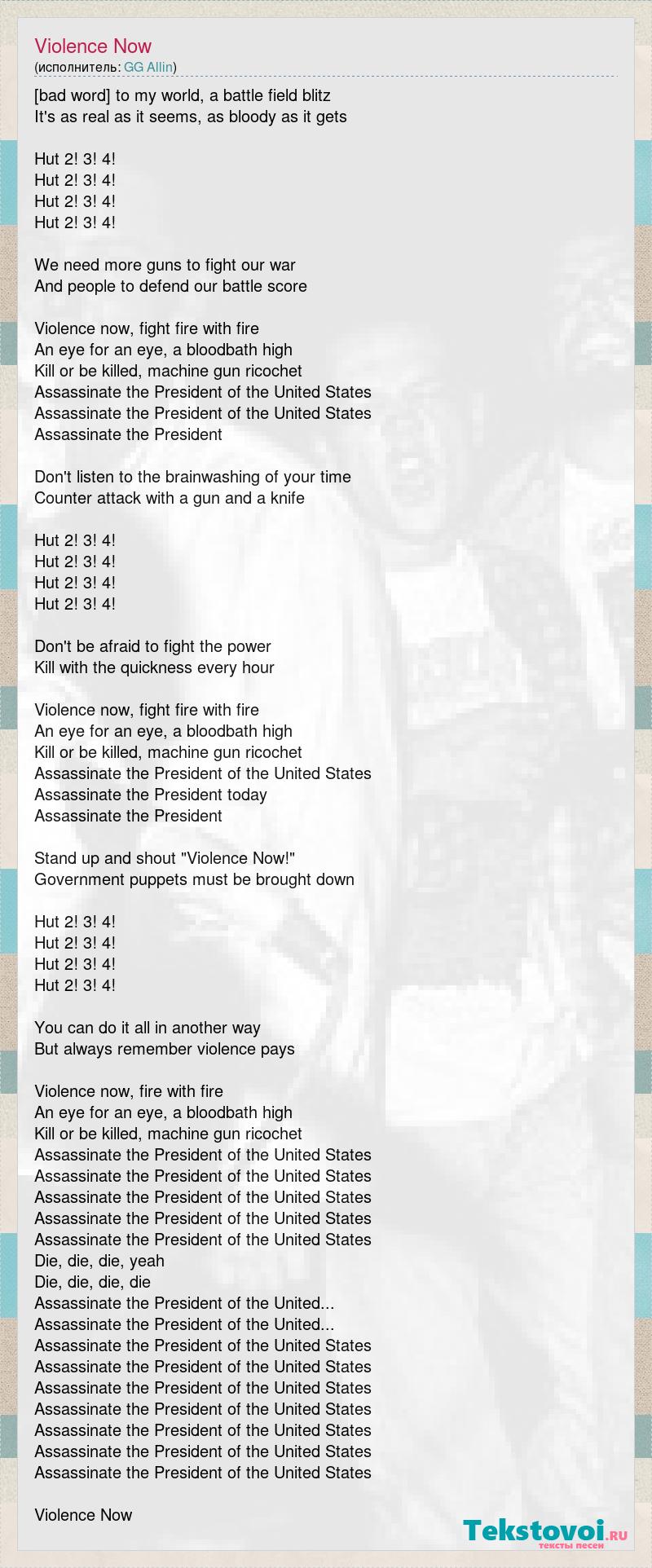 Welcome to my world, a battle field blitz It's as real as it seems, as bloody as it gets Hut 2! 3! 4! Hut 2! 3! 4! Hut 2! 3! 4! Hut 2! 3! 4! We need more guns to fight our war And people to defend our battle score Violence now, fight fire with fire An eye for an eye, a bloodbath high Kill or be killed, machine gun ricochet Assassinate the President of the United States Assassinate the President of the United States Assassinate the President Don't listen to the brainwashing of your time Counter attack with a gun and a knife Hut 2! 3! 4! Hut 2! 3! 4! Hut 2! 3! 4! Hut 2! 3! 4! Don't be afraid to fight the power Kill with the quickness every hour Violence now, fight fire with fire An eye for an eye, a bloodbath high Kill or be killed, machine gun ricochet Assassinate the President of the United States Assassinate the President today Assassinate the President Stand up and shout "Violence Now!" Government puppets must be brought down Hut 2! 3! 4! Hut 2! 3! 4! Hut 2! 3! 4! Hut 2! 3! 4! You can do it all in another way But always remember violence pays Violence now, fire with fire An eye for an eye, a bloodbath high Kill or be killed, machine gun ricochet Assassinate the President of the United States Assassinate the President of the United States Assassinate the President of the United States Assassinate the President of the United States Assassinate the President of the United States Die, die, die, yeah Die, die, die, die Assassinate the President of the United... Assassinate the President of the United... Assassinate the President of the United States Assassinate the President of the United States Assassinate the President of the United States Assassinate the President of the United States Assassinate the President of the United States Assassinate the President of the United States Assassinate the President of the United States Violence Now