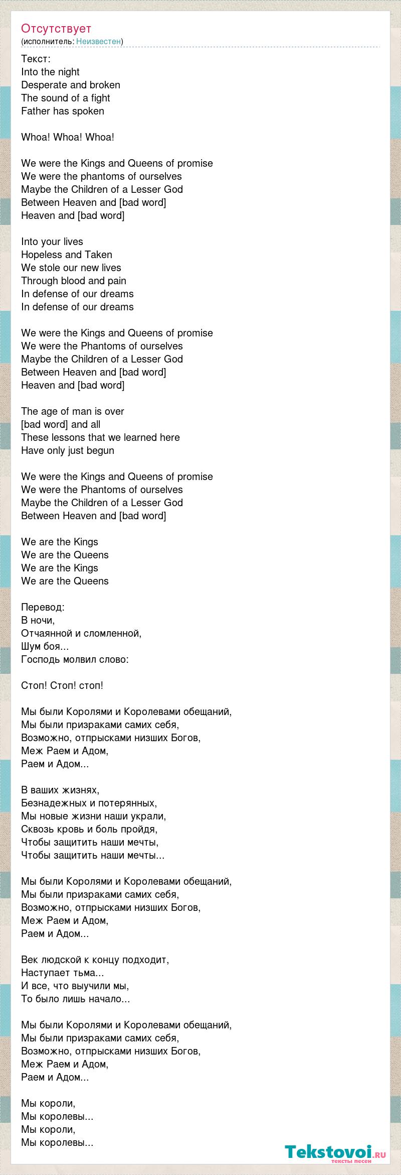 Текст: Into the night Desperate and broken The sound of a fight Father has spoken Whoa! Whoa! Whoa! We were the Kings and Queens of promise We were the phantoms of ourselves Maybe the Children of a Lesser God Between Heaven and Hell Heaven and Hell Into your lives Hopeless and Taken We stole our new lives Through blood and pain In defense of our dreams In defense of our dreams We were the Kings and Queens of promise We were the Phantoms of ourselves Maybe the Children of a Lesser God Between Heaven and Hell Heaven and Hell The age of man is over darkness comes and all These lessons that we learned here Have only just begun We were the Kings and Queens of promise We were the Phantoms of ourselves Maybe the Children of a Lesser God Between Heaven and Hell We are the Kings We are the Queens We are the Kings We are the Queens Перевод: В ночи, Отчаянной и сломленной, Шум боя... Господь молвил слово: Стоп! Стоп! стоп! Мы были Королями и Королевами обещаний, Мы были призраками самих себя, Возможно, отпрысками низших Богов, Меж Раем и Адом, Раем и Адом... В ваших жизнях, Безнадежных и потерянных, Мы новые жизни наши украли, Сквозь кровь и боль пройдя, Чтобы защитить наши мечты, Чтобы защитить наши мечты... Мы были Королями и Королевами обещаний, Мы были призраками самих себя, Возможно, отпрысками низших Богов, Меж Раем и Адом, Раем и Адом... Век людской к концу подходит, Наступает тьма... И все, что выучили мы, То было лишь начало... Мы были Королями и Королевами обещаний, Мы были призраками самих себя, Возможно, отпрысками низших Богов, Меж Раем и Адом, Раем и Адом... Мы короли, Мы королевы... Мы короли, Мы королевы...