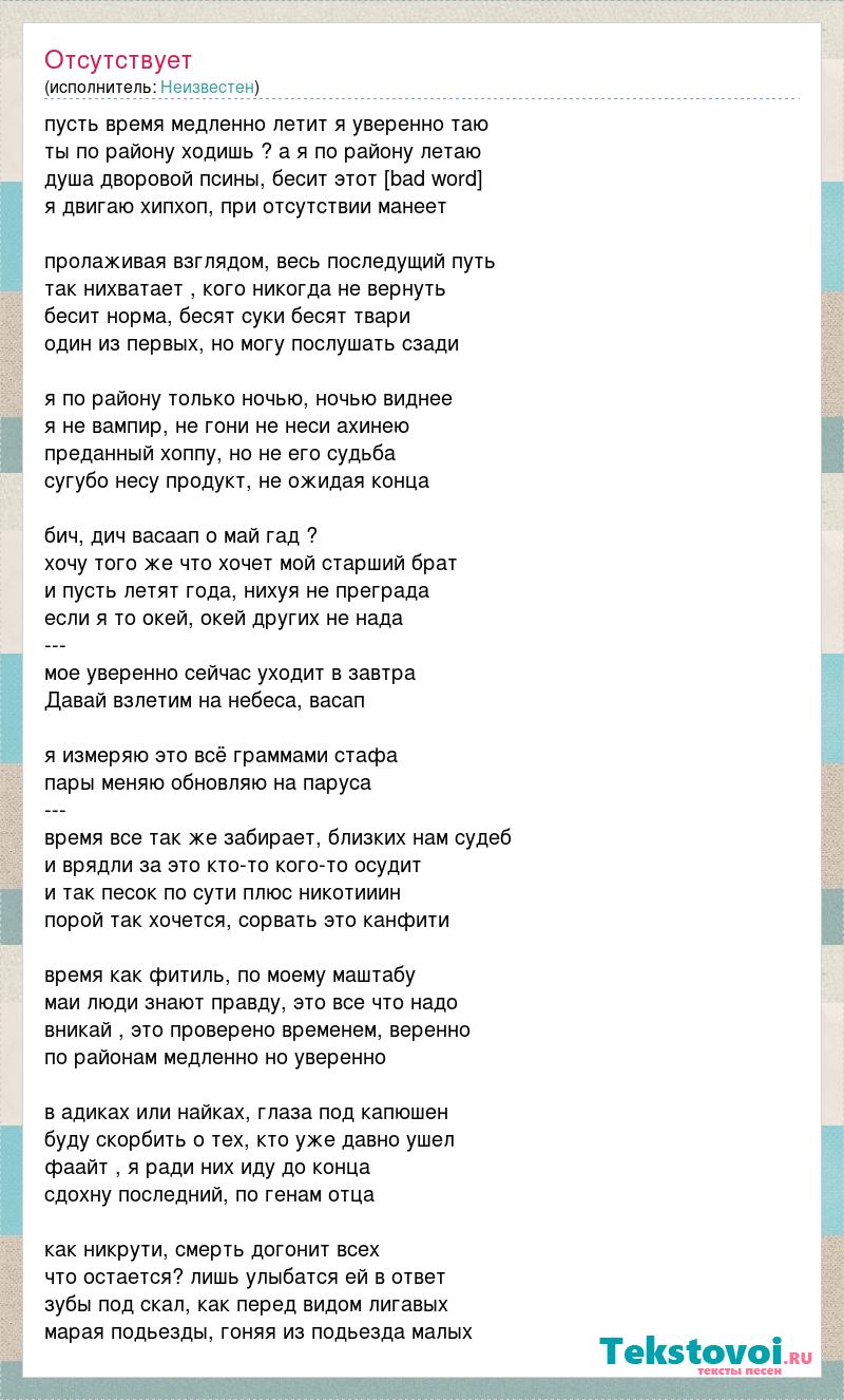 пусть время медленно летит я уверенно таю ты по району ходишь ? а я по району летаю душа дворовой псины, бесит этот [bad word] я двигаю хипхоп, при отсутствии манеет пролаживая взглядом, весь последущий путь так нихватает , кого никогда не вернуть бесит норма, бесят суки бесят твари один из первых, но могу послушать сзади я по району только ночью, ночью виднее я не вампир, не гони не неси ахинею преданный хоппу, но не его судьба сугубо несу продукт, не ожидая конца бич, дич васаап о май гад ? хочу того же что хочет мой старший брат и пусть летят года, нихуя не преграда если я то окей, окей других не нада --- мое уверенно сейчас уходит в завтра Давай взлетим на небеса, васап я измеряю это всё граммами стафа пары меняю обновляю на паруса --- время все так же забирает, близких нам судеб и врядли за это кто-то кого-то осудит и так песок по сути плюс никотииин порой так хочется, сорвать это канфити время как фитиль, по моему маштабу маи люди знают правду, это все что надо вникай , это проверено временем, веренно по районам медленно но уверенно в адиках или найках, глаза под капюшен буду скорбить о тех, кто уже давно ушел фаайт , я ради них иду до конца сдохну последний, по генам отца как никрути, смерть догонит всех что остается? лишь улыбатся ей в ответ зубы под скал, как перед видом лигавых марая подьезды, гоняя из подьезда малых