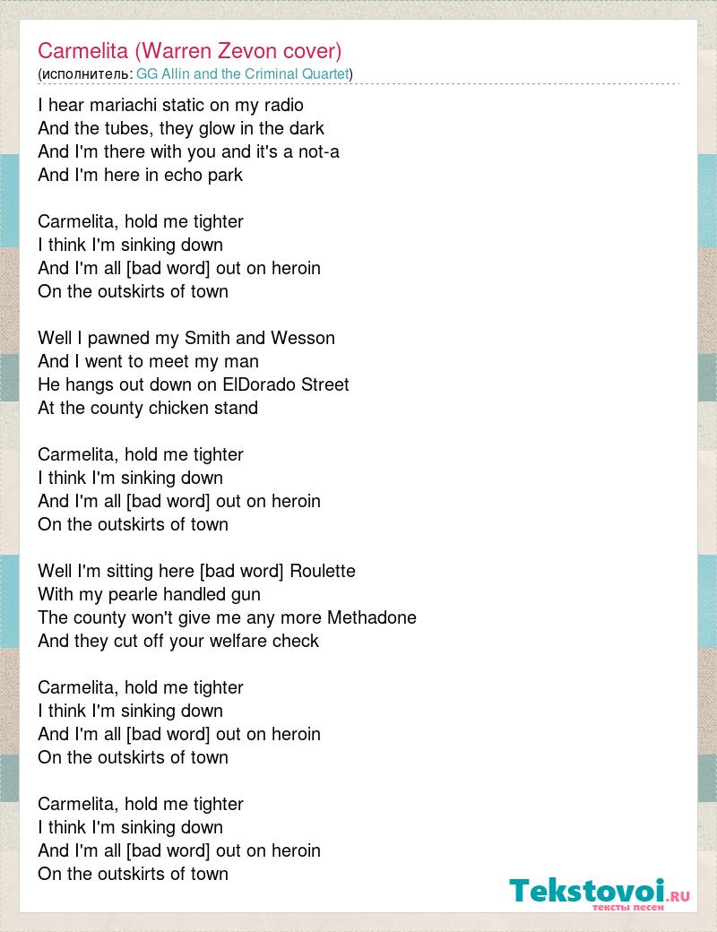 I hear mariachi static on my radio And the tubes, they glow in the dark And I'm there with you and it's a not-a And I'm here in echo park Carmelita, hold me tighter I think I'm sinking down And I'm all strung out on heroin On the outskirts of town Well I pawned my Smith and Wesson And I went to meet my man He hangs out down on ElDorado Street At the county chicken stand Carmelita, hold me tighter I think I'm sinking down And I'm all strung out on heroin On the outskirts of town Well I'm sitting here playing Russian Roulette With my pearle handled gun The county won't give me any more Methadone And they cut off your welfare check Carmelita, hold me tighter I think I'm sinking down And I'm all strung out on heroin On the outskirts of town Carmelita, hold me tighter I think I'm sinking down And I'm all strung out on heroin On the outskirts of town