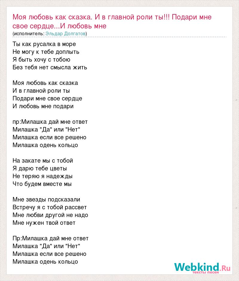Ты как русалка в море Не могу к тебе доплыть Я быть хочу с тобою Без тебя нет смысла жить Моя любовь как сказка И в главной роли ты Подари мне свое сердце И любовь мне подари пр:Милашка дай мне ответ Милашка "Да" или "Нет" Милашка если все решено Милашка одень кольцо На закате мы с тобой Я дарю тебе цветы Не теряю я надежды Что будем вместе мы Мне звезды подсказали Встречу я с тобой рассвет Мне любви другой не надо Мне нужен твой ответ Пр:Милашка дай мне ответ Милашка "Да" или "Нет" Милашка если все решено Милашка одень кольцо
