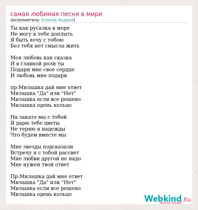 Ты как русалка в море Не могу к тебе доплыть Я быть хочу с тобою Без тебя нет смысла жить Моя любовь как сказка И в главной роли ты Подари мне свое сердце И любовь мне подари пр:Милашка дай мне ответ Милашка "Да" или "Нет" Милашка если все решено Милашка одень кольцо На закате мы с тобой Я дарю тебе цветы Не теряю я надежды Что будем вместе мы Мне звезды подсказали Встречу я с тобой рассвет Мне любви другой не надо Мне нужен твой ответ Пр:Милашка дай мне ответ Милашка "Да" или "Нет" Милашка если все решено Милашка одень кольцо
