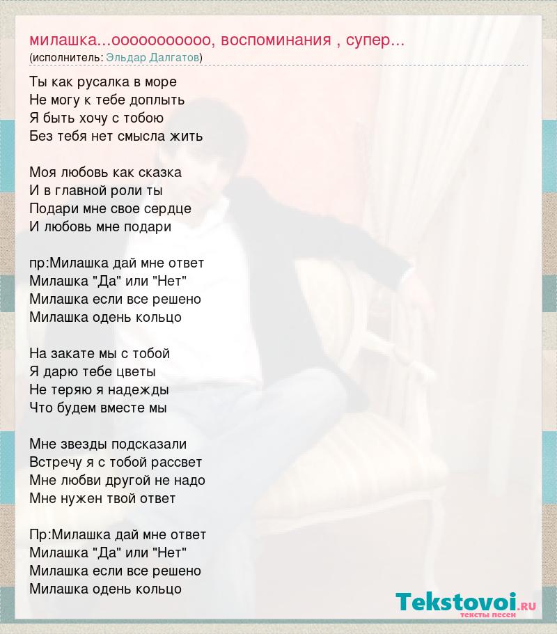 Ты как русалка в море Не могу к тебе доплыть Я быть хочу с тобою Без тебя нет смысла жить Моя любовь как сказка И в главной роли ты Подари мне свое сердце И любовь мне подари пр:Милашка дай мне ответ Милашка "Да" или "Нет" Милашка если все решено Милашка одень кольцо На закате мы с тобой Я дарю тебе цветы Не теряю я надежды Что будем вместе мы Мне звезды подсказали Встречу я с тобой рассвет Мне любви другой не надо Мне нужен твой ответ Пр:Милашка дай мне ответ Милашка "Да" или "Нет" Милашка если все решено Милашка одень кольцо