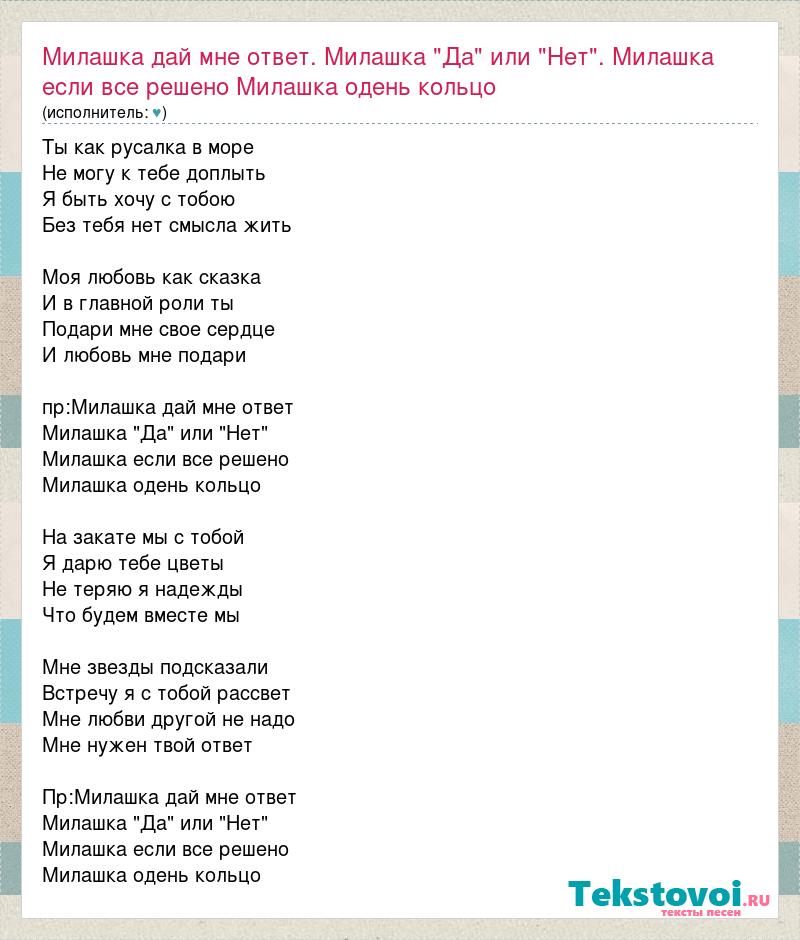 Ты как русалка в море Не могу к тебе доплыть Я быть хочу с тобою Без тебя нет смысла жить Моя любовь как сказка И в главной роли ты Подари мне свое сердце И любовь мне подари пр:Милашка дай мне ответ Милашка "Да" или "Нет" Милашка если все решено Милашка одень кольцо На закате мы с тобой Я дарю тебе цветы Не теряю я надежды Что будем вместе мы Мне звезды подсказали Встречу я с тобой рассвет Мне любви другой не надо Мне нужен твой ответ Пр:Милашка дай мне ответ Милашка "Да" или "Нет" Милашка если все решено Милашка одень кольцо