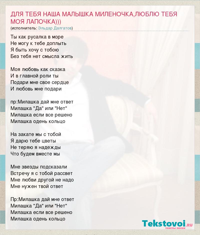 Ты как русалка в море Не могу к тебе доплыть Я быть хочу с тобою Без тебя нет смысла жить Моя любовь как сказка И в главной роли ты Подари мне свое сердце И любовь мне подари пр:Милашка дай мне ответ Милашка "Да" или "Нет" Милашка если все решено Милашка одень кольцо На закате мы с тобой Я дарю тебе цветы Не теряю я надежды Что будем вместе мы Мне звезды подсказали Встречу я с тобой рассвет Мне любви другой не надо Мне нужен твой ответ Пр:Милашка дай мне ответ Милашка "Да" или "Нет" Милашка если все решено Милашка одень кольцо