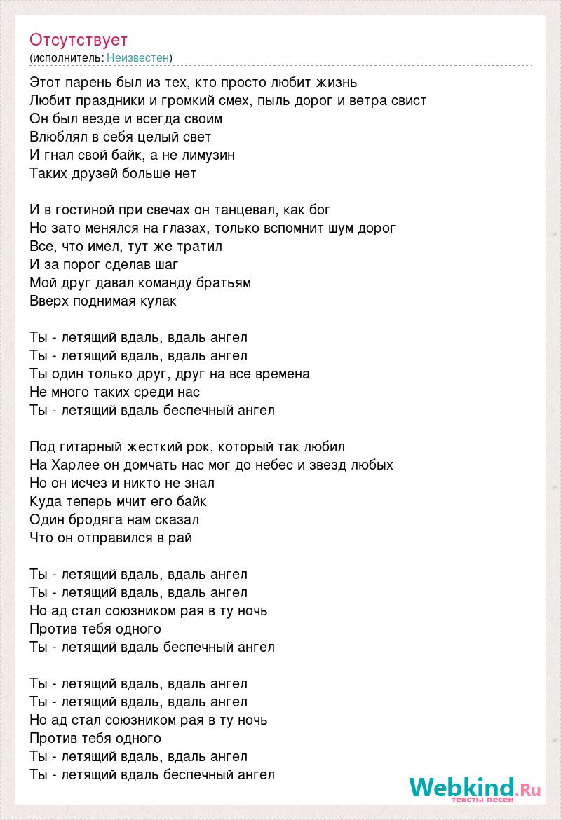 Этот парень был из тех, кто просто любит жизнь Любит праздники и громкий смех, пыль дорог и ветра свист Он был везде и всегда своим Влюблял в себя целый свет И гнал свой байк, а не лимузин Таких друзей больше нет И в гостиной при свечах он танцевал, как бог Но зато менялся на глазах, только вспомнит шум дорог Все, что имел, тут же тратил И за порог сделав шаг Мой друг давал команду братьям Вверх поднимая кулак Ты - летящий вдаль, вдаль ангел Ты - летящий вдаль, вдаль ангел Ты один только друг, друг на все времена Не много таких среди нас Ты - летящий вдаль беспечный ангел Под гитарный жесткий рок, который так любил На Харлее он домчать нас мог до небес и звезд любых Но он исчез и никто не знал Куда теперь мчит его байк Один бродяга нам сказал Что он отправился в рай Ты - летящий вдаль, вдаль ангел Ты - летящий вдаль, вдаль ангел Но ад стал союзником рая в ту ночь Против тебя одного Ты - летящий вдаль беспечный ангел Ты - летящий вдаль, вдаль ангел Ты - летящий вдаль, вдаль ангел Но ад стал союзником рая в ту ночь Против тебя одного Ты - летящий вдаль, вдаль ангел Ты - летящий вдаль беспечный ангел