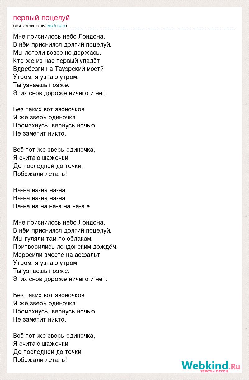 Мне приснилось небо Лондона. В нём приснился долгий поцелуй. Мы летели вовсе не держась. Кто же из нас первый упадёт Вдребезги на Тауэрский мост? Утром, я узнаю утром. Ты узнаешь позже. Этих снов дороже ничего и нет. Без таких вот звоночков Я же зверь одиночка Промахнусь, вернусь ночью Не заметит никто. Всё тот же зверь одиночка, Я считаю шажочки До последней до точки. Побежали летать! На-на на-на на-на На-на на-на на-на На-на на на на-а на на-а э Мне приснилось небо Лондона. В нём приснился долгий поцелуй. Мы гуляли там по облакам. Притворились лондонским дождём. Моросили вместе на асфальт Утром, я узнаю утром Ты узнаешь позже. Этих снов дороже ничего и нет. Без таких вот звоночков Я же зверь одиночка Промахнусь, вернусь ночью Не заметит никто. Всё тот же зверь одиночка, Я считаю шажочки До последней до точки. Побежали летать!