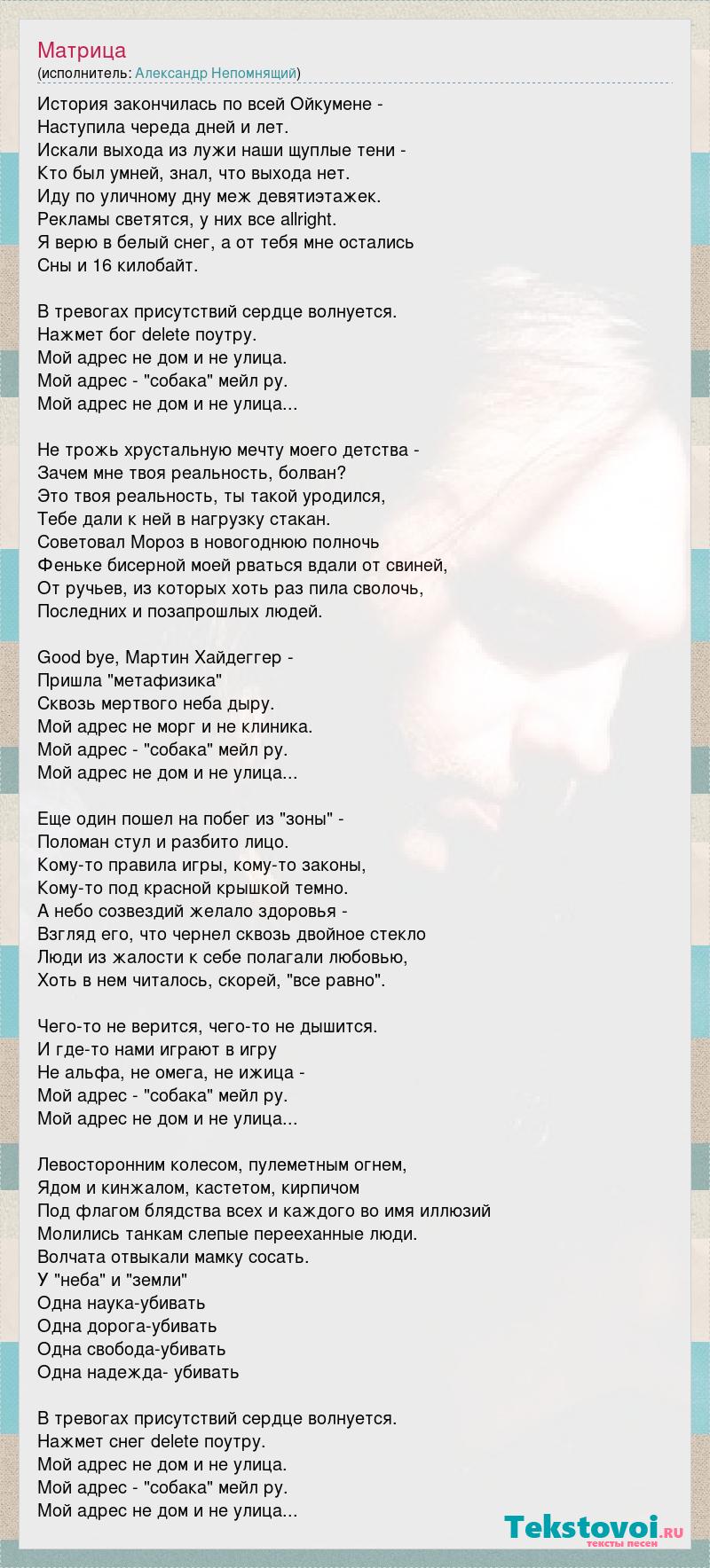 История закончилась по всей Ойкумене - Наступила череда дней и лет. Искали выхода из лужи наши щуплые тени - Кто был умней, знал, что выхода нет. Иду по уличному дну меж девятиэтажек. Рекламы светятся, у них все allright. Я верю в белый снег, а от тебя мне остались Сны и 16 килобайт. В тревогах присутствий сердце волнуется. Нажмет бог delete поутру. Мой адрес не дом и не улица. Мой адрес - "собака" мейл ру. Мой адрес не дом и не улица... Не трожь хрустальную мечту моего детства - Зачем мне твоя реальность, болван? Это твоя реальность, ты такой уродился, Тебе дали к ней в нагрузку стакан. Советовал Мороз в новогоднюю полночь Феньке бисерной моей рваться вдали от свиней, От ручьев, из которых хоть раз пила сволочь, Последних и позапрошлых людей. Good bye, Мартин Хайдеггер - Пришла "метафизика" Сквозь мертвого неба дыру. Мой адрес не морг и не клиника. Мой адрес - "собака" мейл ру. Мой адрес не дом и не улица... Еще один пошел на побег из "зоны" - Поломан стул и разбито лицо. Кому-то правила игры, кому-то законы, Кому-то под красной крышкой темно. А небо созвездий желало здоровья - Взгляд его, что чернел сквозь двойное стекло Люди из жалости к себе полагали любовью, Хоть в нем читалось, скорей, "все равно". Чего-то не верится, чего-то не дышится. И где-то нами играют в игру Не альфа, не омега, не ижица - Мой адрес - "собака" мейл ру. Мой адрес не дом и не улица... Левосторонним колесом, пулеметным огнем, Ядом и кинжалом, кастетом, кирпичом Под флагом блядства всех и каждого во имя иллюзий Молились танкам слепые перееханные люди. Волчата отвыкали мамку сосать. У "неба" и "земли" Одна наука-убивать Одна дорога-убивать Одна свобода-убивать Одна надежда- убивать В тревогах присутствий сердце волнуется. Нажмет снег delete поутру. Мой адрес не дом и не улица. Мой адрес - "собака" мейл ру. Мой адрес не дом и не улица...