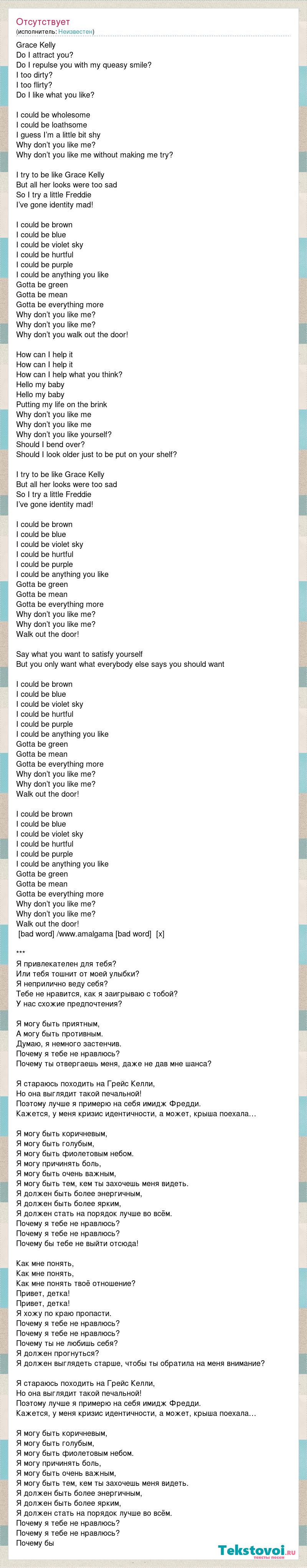 Grace Kelly Do I attract you? Do I repulse you with my queasy smile? I too dirty? I too flirty? Do I like what you like? I could be wholesome I could be loathsome I guess I’m a little bit shy Why don’t you like me? Why don’t you like me without making me try? I try to be like Grace Kelly But all her looks were too sad So I try a little Freddie I’ve gone identity mad! I could be brown I could be blue I could be violet sky I could be hurtful I could be purple I could be anything you like Gotta be green Gotta be mean Gotta be everything more Why don’t you like me? Why don’t you like me? Why don’t you walk out the door! How can I help it How can I help it How can I help what you think? Hello my baby Hello my baby Putting my life on the brink Why don’t you like me Why don’t you like me Why don’t you like yourself? Should I bend over? Should I look older just to be put on your shelf? I try to be like Grace Kelly But all her looks were too sad So I try a little Freddie I’ve gone identity mad! I could be brown I could be blue I could be violet sky I could be hurtful I could be purple I could be anything you like Gotta be green Gotta be mean Gotta be everything more Why don’t you like me? Why don’t you like me? Walk out the door! Say what you want to satisfy yourself But you only want what everybody else says you should want I could be brown I could be blue I could be violet sky I could be hurtful I could be purple I could be anything you like Gotta be green Gotta be mean Gotta be everything more Why don’t you like me? Why don’t you like me? Walk out the door! I could be brown I could be blue I could be violet sky I could be hurtful I could be purple I could be anything you like Gotta be green Gotta be mean Gotta be everything more Why don’t you like me? Why don’t you like me? Walk out the door! [bad word] /www.amalgama [bad word] [x] *** Я привлекателен для тебя? Или тебя тошнит от моей улыбки? Я неприлично веду себя? Тебе не нравится, как я заигрываю с тобой? У нас схожие предпочтения? Я могу быть приятным, А могу быть противным. Думаю, я немного застенчив. Почему я тебе не нравлюсь? Почему ты отвергаешь меня, даже не дав мне шанса? Я стараюсь походить на Грейс Келли, Но она выглядит такой печальной! Поэтому лучше я примерю на себя имидж Фредди. Кажется, у меня кризис идентичности, а может, крыша поехала… Я могу быть коричневым, Я могу быть голубым, Я могу быть фиолетовым небом. Я могу причинять боль, Я могу быть очень важным, Я могу быть тем, кем ты захочешь меня видеть. Я должен быть более энергичным, Я должен быть более ярким, Я должен стать на порядок лучше во всём. Почему я тебе не нравлюсь? Почему я тебе не нравлюсь? Почему бы тебе не выйти отсюда! Как мне понять, Как мне понять, Как мне понять твоё отношение? Привет, детка! Привет, детка! Я хожу по краю пропасти. Почему я тебе не нравлюсь? Почему я тебе не нравлюсь? Почему ты не любишь себя? Я должен прогнуться? Я должен выглядеть старше, чтобы ты обратила на меня внимание? Я стараюсь походить на Грейс Келли, Но она выглядит такой печальной! Поэтому лучше я примерю на себя имидж Фредди. Кажется, у меня кризис идентичности, а может, крыша поехала… Я могу быть коричневым, Я могу быть голубым, Я могу быть фиолетовым небом. Я могу причинять боль, Я могу быть очень важным, Я могу быть тем, кем ты захочешь меня видеть. Я должен быть более энергичным, Я должен быть более ярким, Я должен стать на порядок лучше во всём. Почему я тебе не нравлюсь? Почему я тебе не нравлюсь? Почему бы