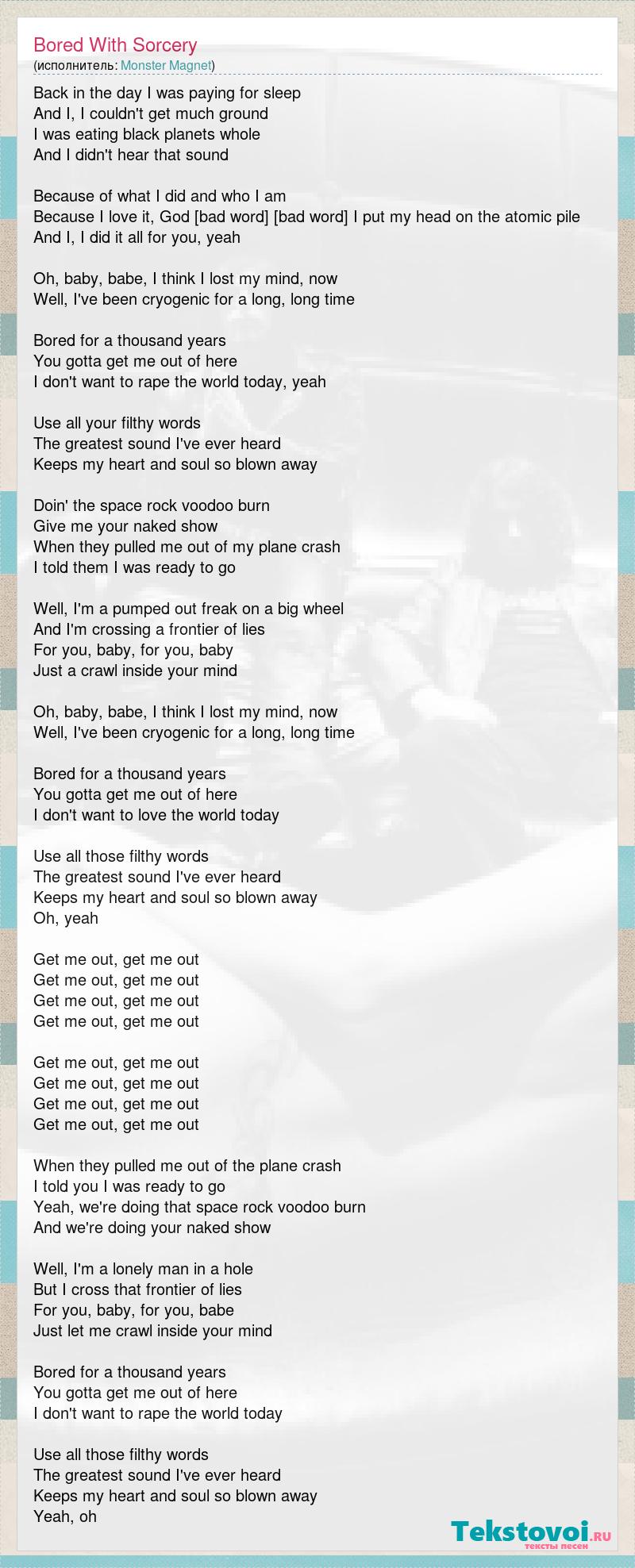 Back in the day I was paying for sleep And I, I couldn't get much ground I was eating black planets whole And I didn't hear that sound Because of what I did and who I am Because I love it, God [bad word] true I put my head on the atomic pile And I, I did it all for you, yeah Oh, baby, babe, I think I lost my mind, now Well, I've been cryogenic for a long, long time Bored for a thousand years You gotta get me out of here I don't want to rape the world today, yeah Use all your filthy words The greatest sound I've ever heard Keeps my heart and soul so blown away Doin' the space rock voodoo burn Give me your naked show When they pulled me out of my plane crash I told them I was ready to go Well, I'm a pumped out freak on a big wheel And I'm crossing a frontier of lies For you, baby, for you, baby Just a crawl inside your mind Oh, baby, babe, I think I lost my mind, now Well, I've been cryogenic for a long, long time Bored for a thousand years You gotta get me out of here I don't want to love the world today Use all those filthy words The greatest sound I've ever heard Keeps my heart and soul so blown away Oh, yeah Get me out, get me out Get me out, get me out Get me out, get me out Get me out, get me out Get me out, get me out Get me out, get me out Get me out, get me out Get me out, get me out When they pulled me out of the plane crash I told you I was ready to go Yeah, we're doing that space rock voodoo burn And we're doing your naked show Well, I'm a lonely man in a hole But I cross that frontier of lies For you, baby, for you, babe Just let me crawl inside your mind Bored for a thousand years You gotta get me out of here I don't want to rape the world today Use all those filthy words The greatest sound I've ever heard Keeps my heart and soul so blown away Yeah, oh
