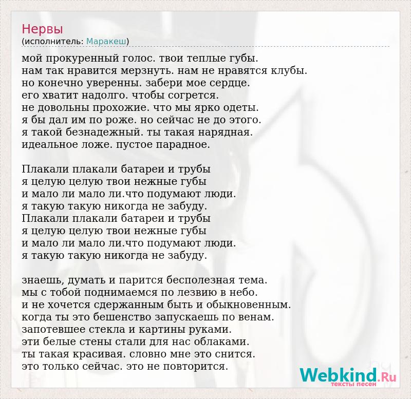 мой прокуренный голос. твои теплые губы. нам так нравится мерзнуть. нам не нравятся клубы. но конечно уверенны. забери мое сердце. его хватит надолго. чтобы согрется. не довольны прохожие. что мы ярко одеты. я бы дал им по роже. но сейчас не до этого. я такой безнадежный. ты такая нарядная. идеальное ложе. пустое парадное. Плакали плакали батареи и трубы я целую целую твои нежные губы и мало ли мало ли.что подумают люди. я такую такую никогда не забуду. Плакали плакали батареи и трубы я целую целую твои нежные губы и мало ли мало ли.что подумают люди. я такую такую никогда не забуду. знаешь, думать и парится бесполезная тема. мы с тобой поднимаемся по лезвию в небо. и не хочется сдержанным быть и обыкновенным. когда ты это бешенство запускаешь по венам. запотевшее стекла и картины руками. эти белые стены стали для нас облаками. ты такая красивая. словно мне это снится. это только сейчас. это не повторится.