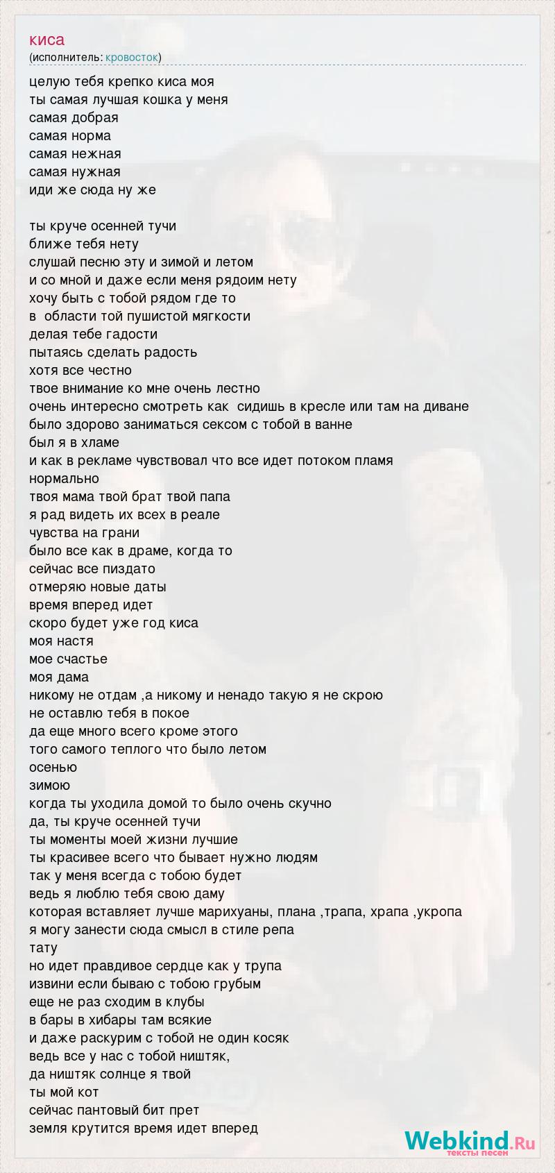 целую тебя крепко киса моя ты самая лучшая кошка у меня самая добрая самая норма самая нежная самая нужная иди же сюда ну же ты круче осенней тучи ближе тебя нету слушай песню эту и зимой и летом и со мной и даже если меня рядоим нету хочу быть с тобой рядом где то в области той пушистой мягкости делая тебе гадости пытаясь сделать радость хотя все честно твое внимание ко мне очень лестно очень интересно смотреть как сидишь в кресле или там на диване было здорово заниматься сексом с тобой в ванне был я в хламе и как в рекламе чувствовал что все идет потоком пламя нормально твоя мама твой брат твой папа я рад видеть их всех в реале чувства на грани было все как в драме, когда то сейчас все пиздато отмеряю новые даты время вперед идет скоро будет уже год киса моя настя мое счастье моя дама никому не отдам ,а никому и ненадо такую я не скрою не оставлю тебя в покое да еще много всего кроме этого того самого теплого что было летом осенью зимою когда ты уходила домой то было очень скучно да, ты круче осенней тучи ты моменты моей жизни лучшие ты красивее всего что бывает нужно людям так у меня всегда с тобою будет ведь я люблю тебя свою даму которая вставляет лучше марихуаны, плана ,трапа, храпа ,укропа я могу занести сюда смысл в стиле репа тату но идет правдивое сердце как у трупа извини если бываю с тобою грубым еще не раз сходим в клубы в бары в хибары там всякие и даже раскурим с тобой не один косяк ведь все у нас с тобой ништяк, да ништяк солнце я твой ты мой кот сейчас пантовый бит прет земля крутится время идет вперед
